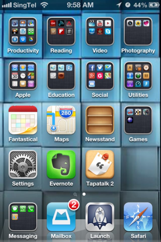 Most of the time I one-hand the phone, so I started placing my most used apps along my thumb arc on each page. That helps avoid the long reach for stuff I use the most on ip5. It looks a little odd on the screen, but it's surprisingly effective.