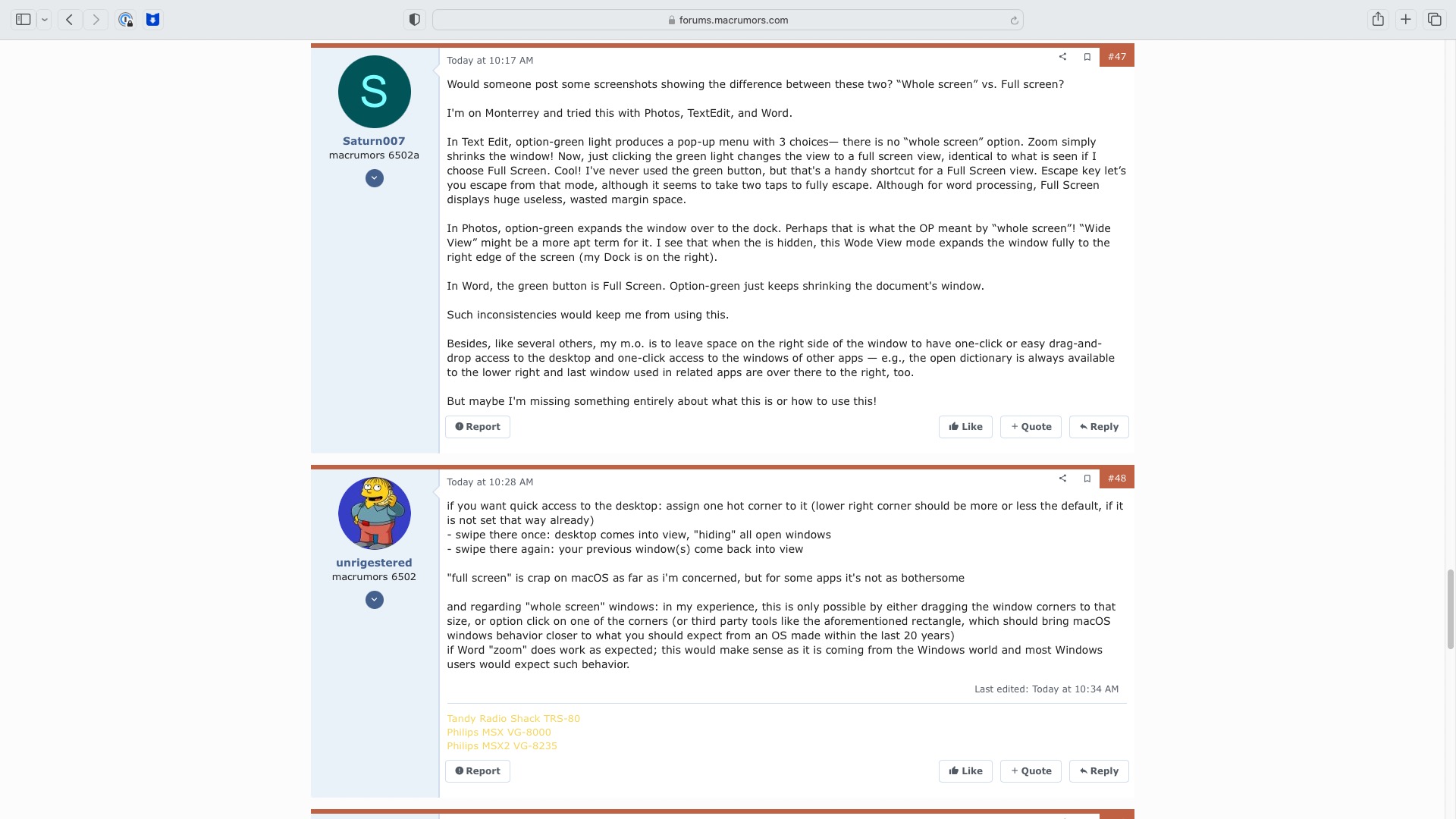 In Text Edit, option-green light produces a pop-up menu with 3 choices— there is no “whole screen” option. Zoom simply shrinks the window! Now, just clicking the green light changes the view to a full screen view, identical to what is seen if I choose Full Screen. Cool! I've never used the green button, but that's a handy shortcut for a Full Screen view. Escape key let’s you escape from that mode, although it seems to take two taps to fully escape. Although for word processing, Full Screen displays huge useless, wasted margin space.