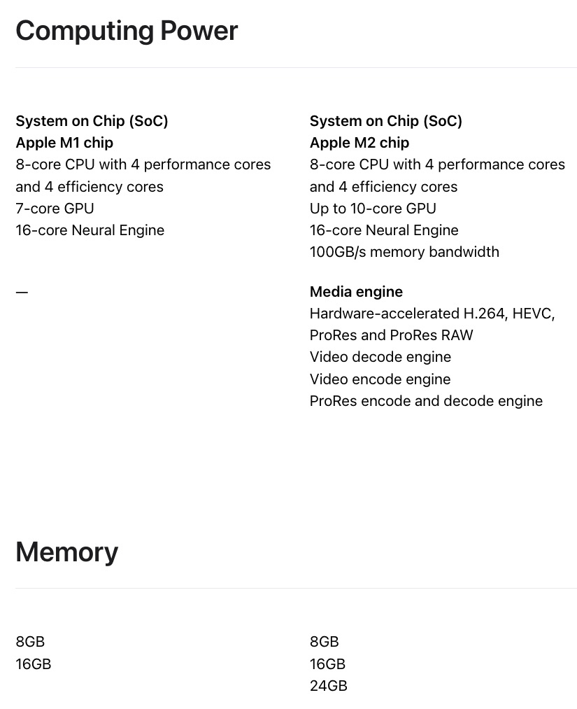 Leads one to believe there's no media engine in the M1, whereas in reality they've beefed it up and given it ProRes. And IIRC the M1 has 70GB/s memory bandwidth, not... well, none.