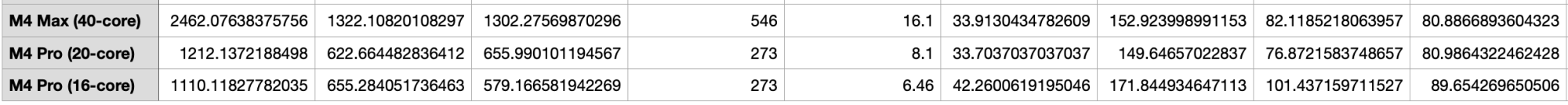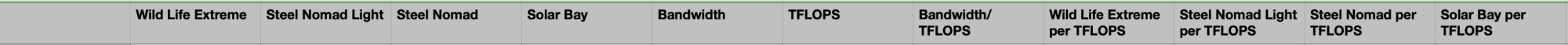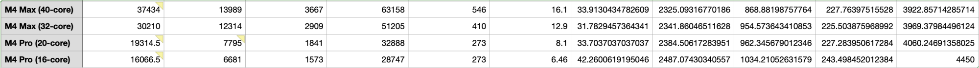 Also, the pattern you noted with the M3 Ultra is actually repeated in the M4 line as well, I looked pretty closely at the binned/full pro/max using the 3DMark benchmarks (and Blender too actually) - sometimes seemingly related to bandwidth issues, other times less clear (well one time anyway - one data point on the Steel Nomad Light benchmark makes no sense to me, but everything else including the full Steel Nomad bench results tracks okay). The clearest result was that the binned M4 Pro has the best bandwidth/TFLOPS ratio of the pro/max M4 lineup and the best scores per TFLOPS amongst those devices. Again, that's why I was being careful to make sure people understood this is just a rough estimation.