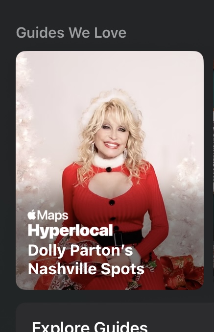 Dolly Parton in a skimpy low-cut red outfit, with her huge fake breasts. Right in my face. Apple Maps is rated for ages 4+.