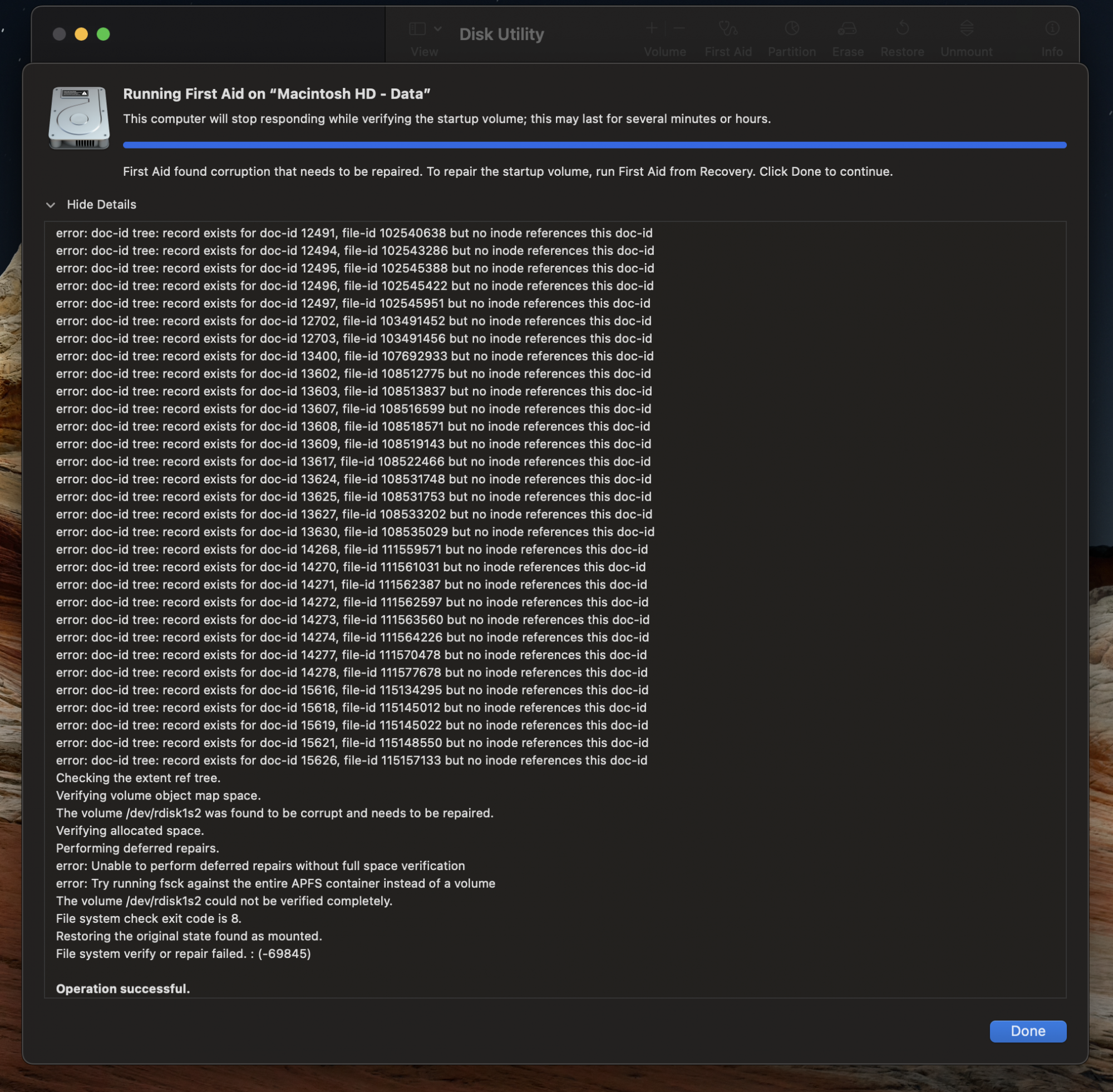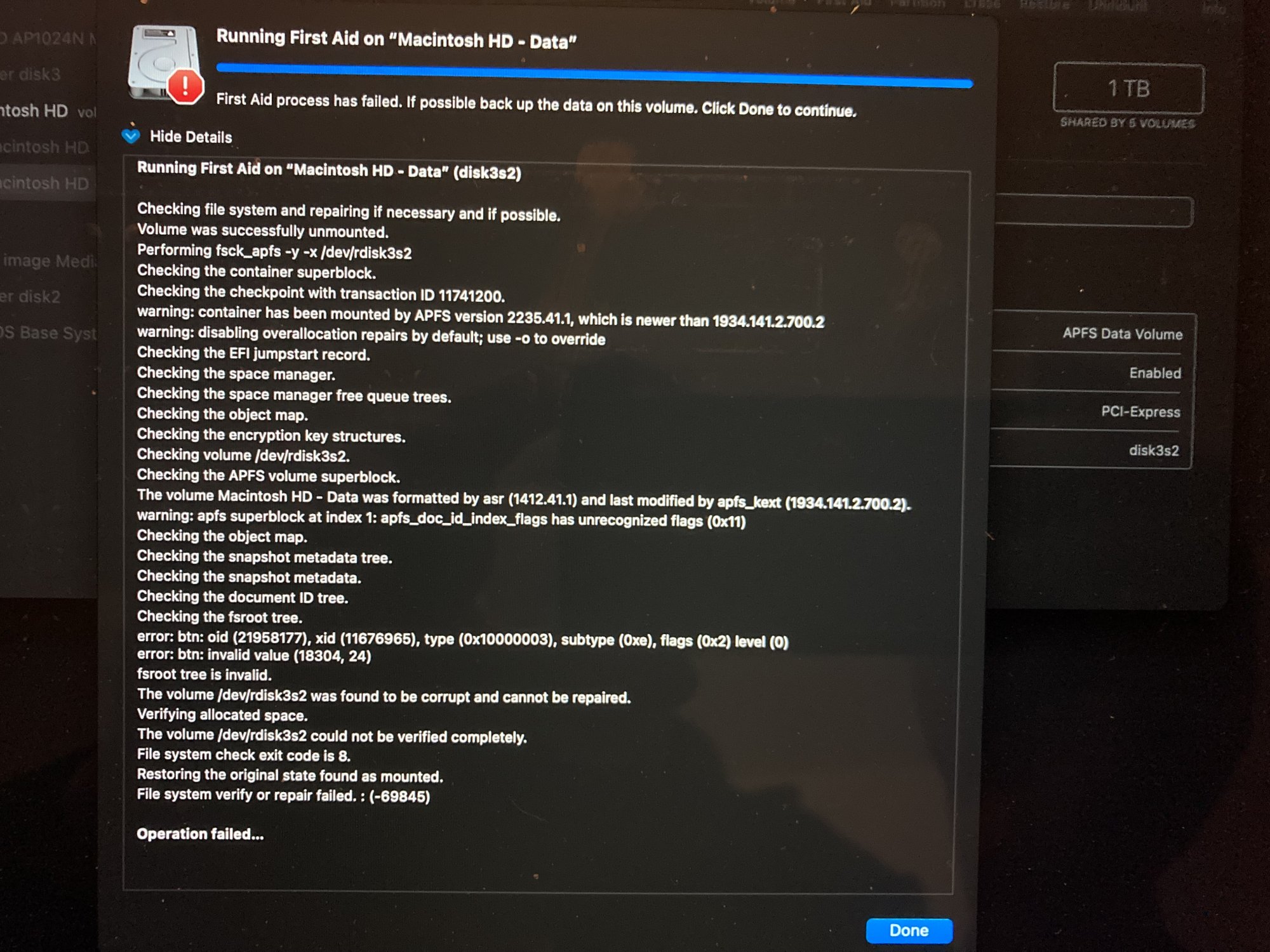 File System verify or repair failed. : (-69845)