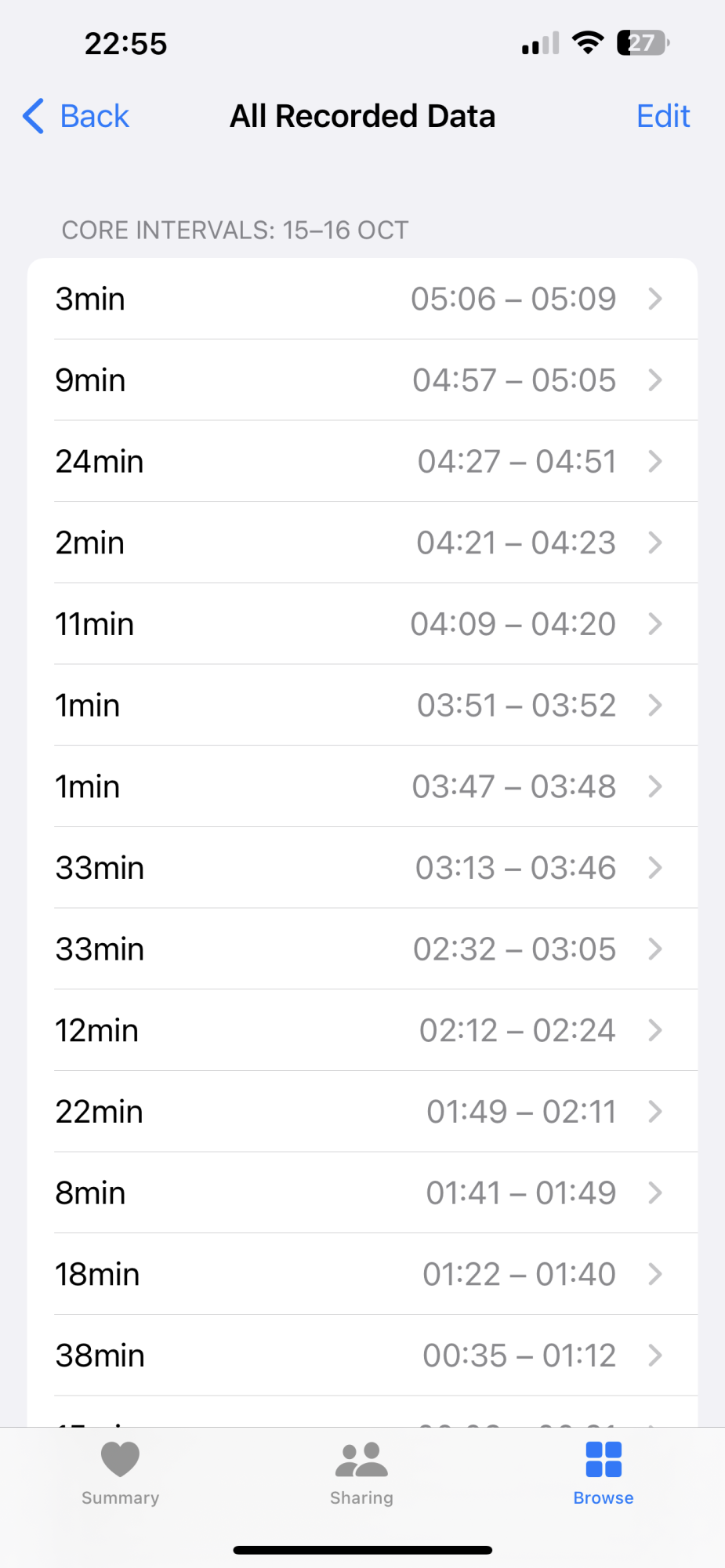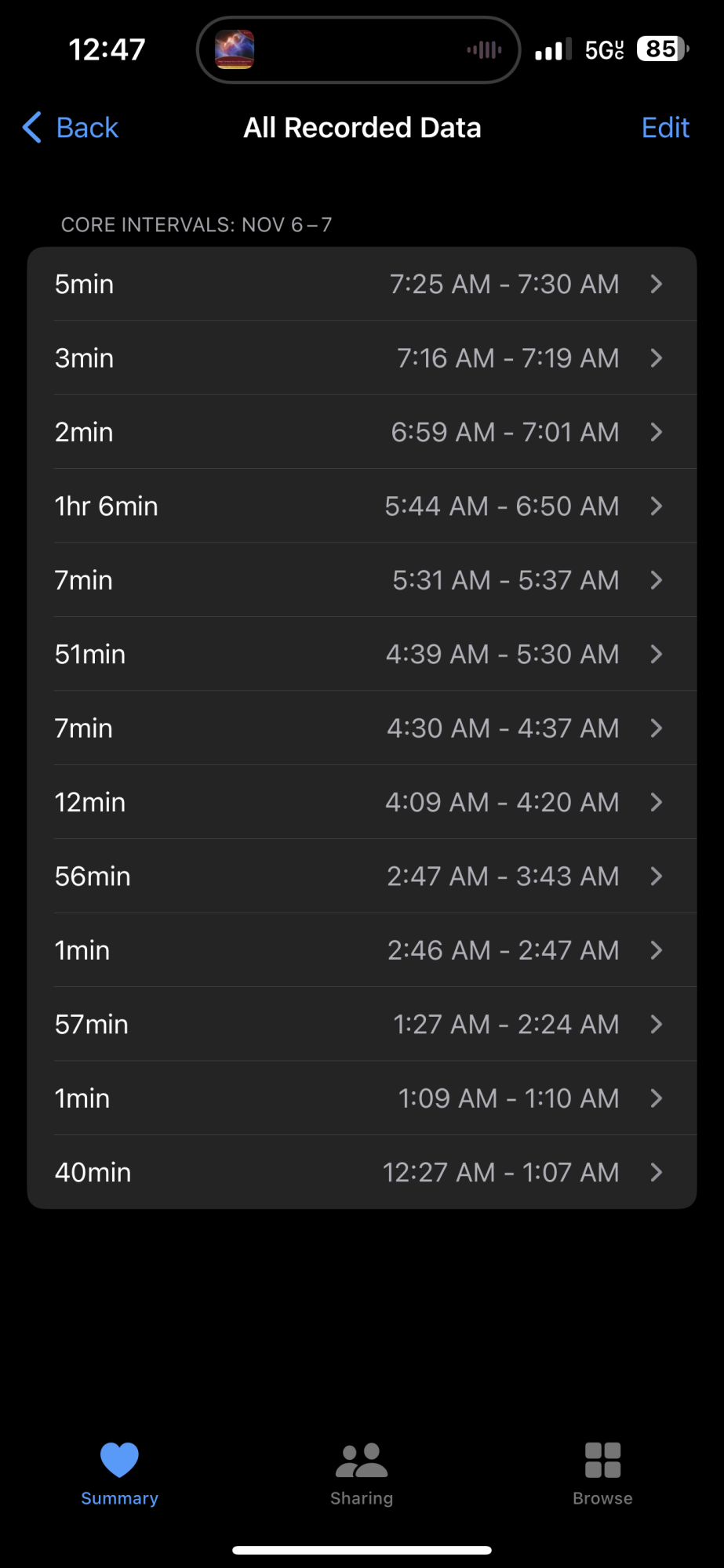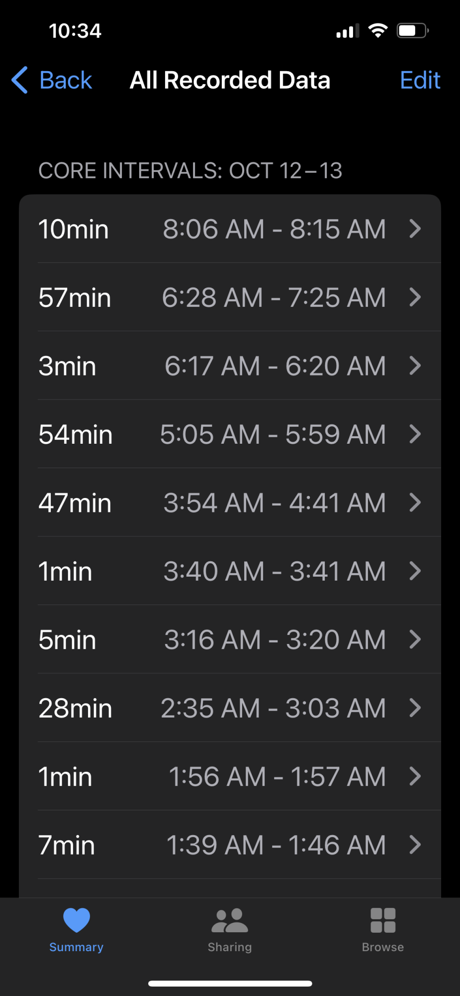 Just to confirm this, are you seeing raw data for times outside your schedule in Health > Sleep > Show all Data >All Recorded Data, like this:Yes. I have my wake up time set at 7 am, but slept until 8:16 this morning and it tracked it all the way through.