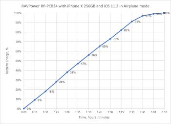Given the lack of official information on whether 7.5w fast charging is encrypted (as mentioned in the MacRumors test article) I decided to run my own test to see how long it takes for RAVPower to charge an iPhone X 256GB, and then compare the result to 5w and 7.5w results reported by MacRumors. The phone started charging at 0% and as soon as it booted in about 3 minutes, was placed it in the airplane mode to eliminate the effect of data etc.