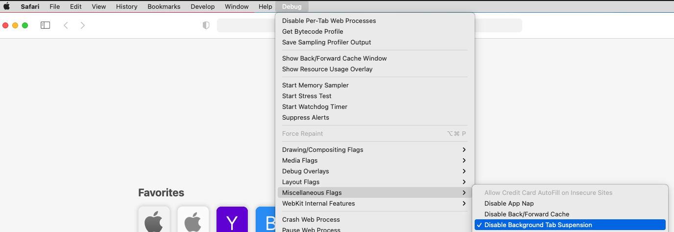 - start Safari and uncheck the Disable Background Tab Suspension seen in the image above
