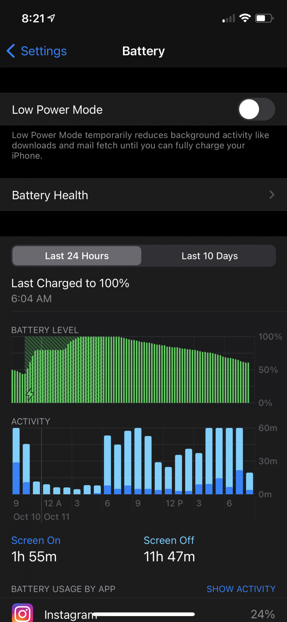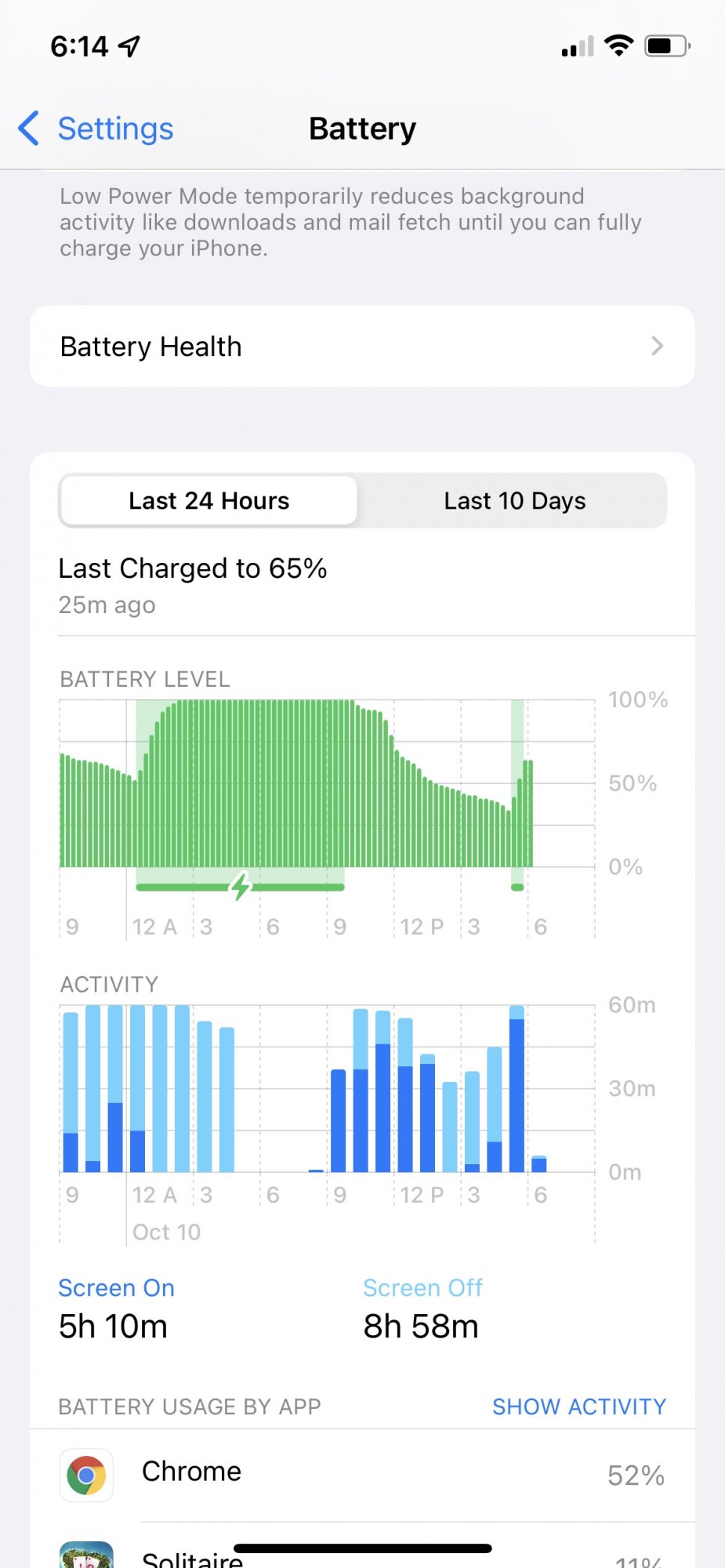 Post that battery usage again. This time make sure to select "Show Activity" and as many apps as possible. You seem to have a lot of background activity that might be unexpected. "Show Activity" will give you an idea on what is running in the background draining the battery.Does this battery usage look normal? All screen time and usage (I think that’s inflated) was on WiFi.