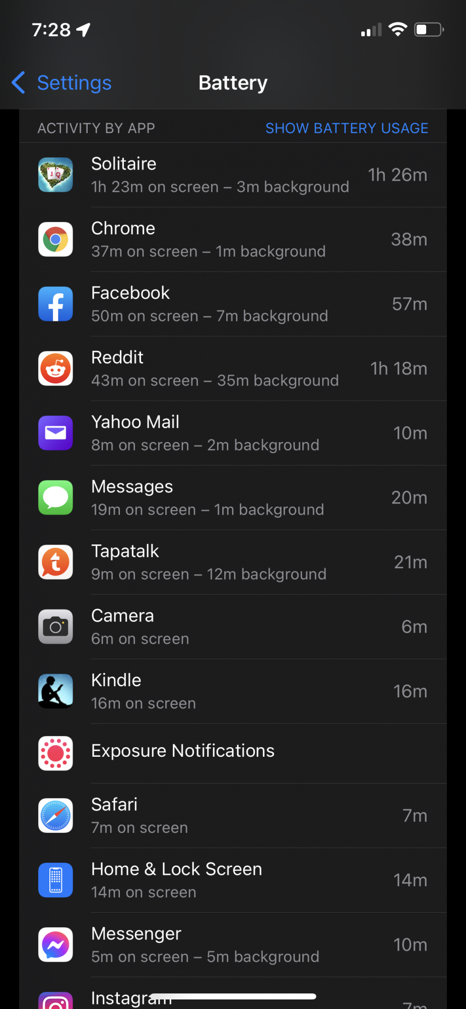 I checked my partner’s device. Same device, and both apps run in the background on hers too. Here’s her battery usage:Okay. I only point out what might be causing your battery drain.