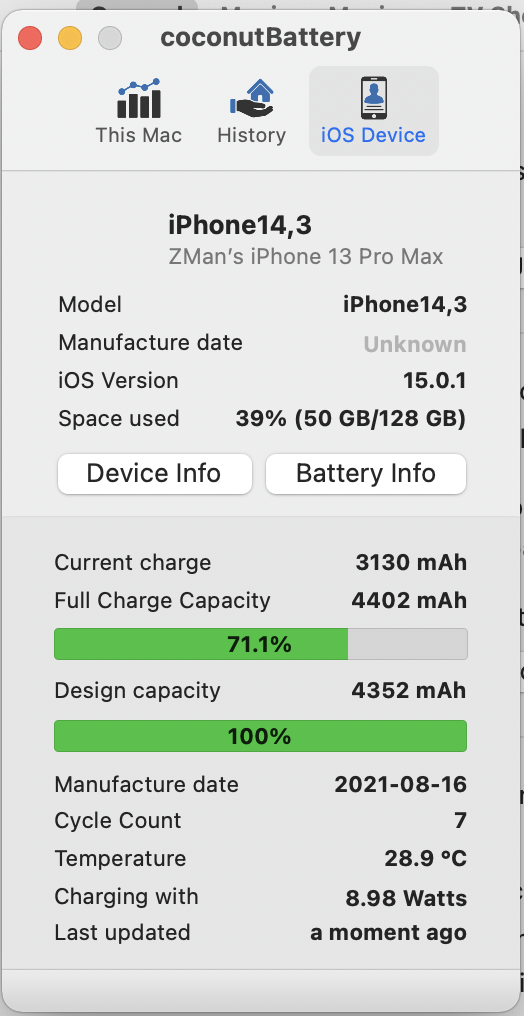 My max capacity is 4402 mAh. Coconut Battery says 71% charged. iPhone battery indicator says 75%.