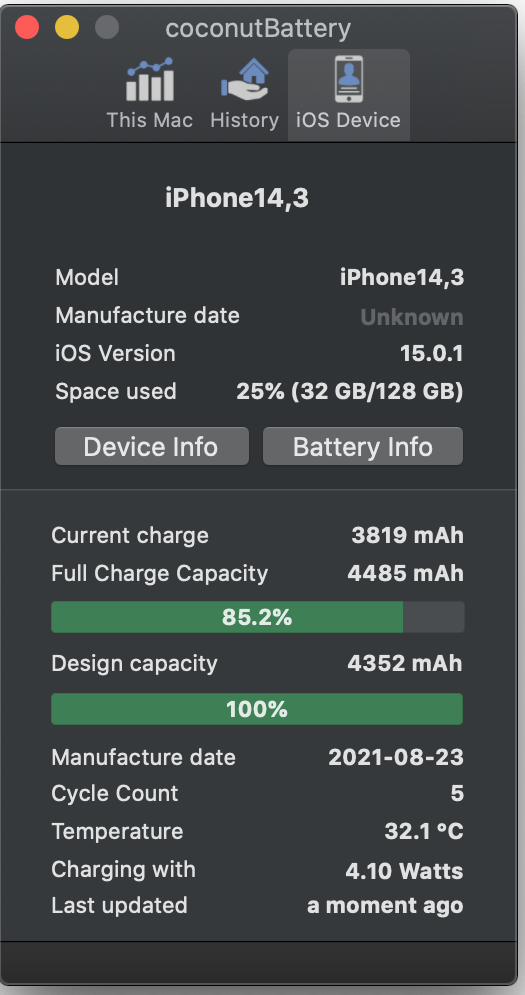 I notice that the FCC tends to fluctuate. When charging, highest I got was 4496 and as low as 4460 when not charge and fluctuate depend on use but I don't really bother with that.I noticed something interesting. I went back and looked at the information given by CoconutBattery again. What I noticed was the Full Charge Capacity started to rise as the phone was being charged. And as the battery charge closed the gap between the percentage reported by CoconutBattery and iOS got smaller. So right now my Full Charge Capacity went from 4472 to 4485, I stopped charging the battery at 86%. CoconutBattery is reporting 85.2%.