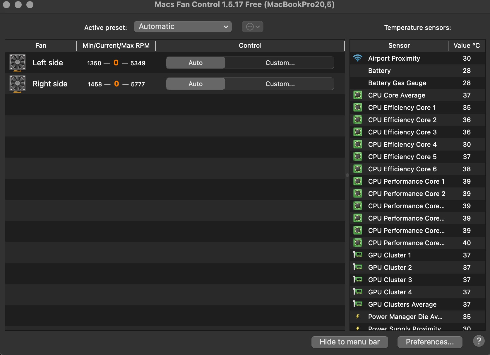I went for the 32G/1T version. I was afraid that would make the temps go a little higher, but no, it is in the ballpark of the M1 Pro, around 32~36ºC, but not as low as the M1 Air 13 2020 that I also have, that one idles at 27~30 ºC.