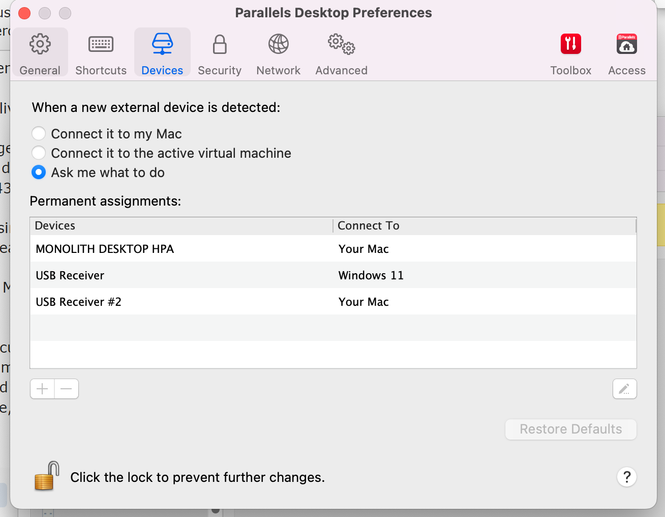 I've checked the USB options in Parallels and dont see the usb-c to hdmi adapter as an option, and I dont see a separate spot to enable my thunderbolt ports (where the dongle/hdmi cable is connected) to Parallels.