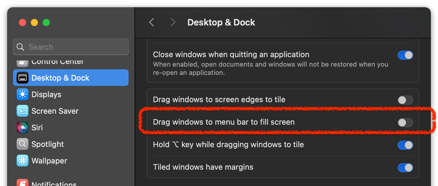 Even if you set the "Drag windows to menu bar to fill screen" setting in "Desktop & Dock" in System Settings to OFF, if you close System Settings and reopen it, it will appear to be ON.