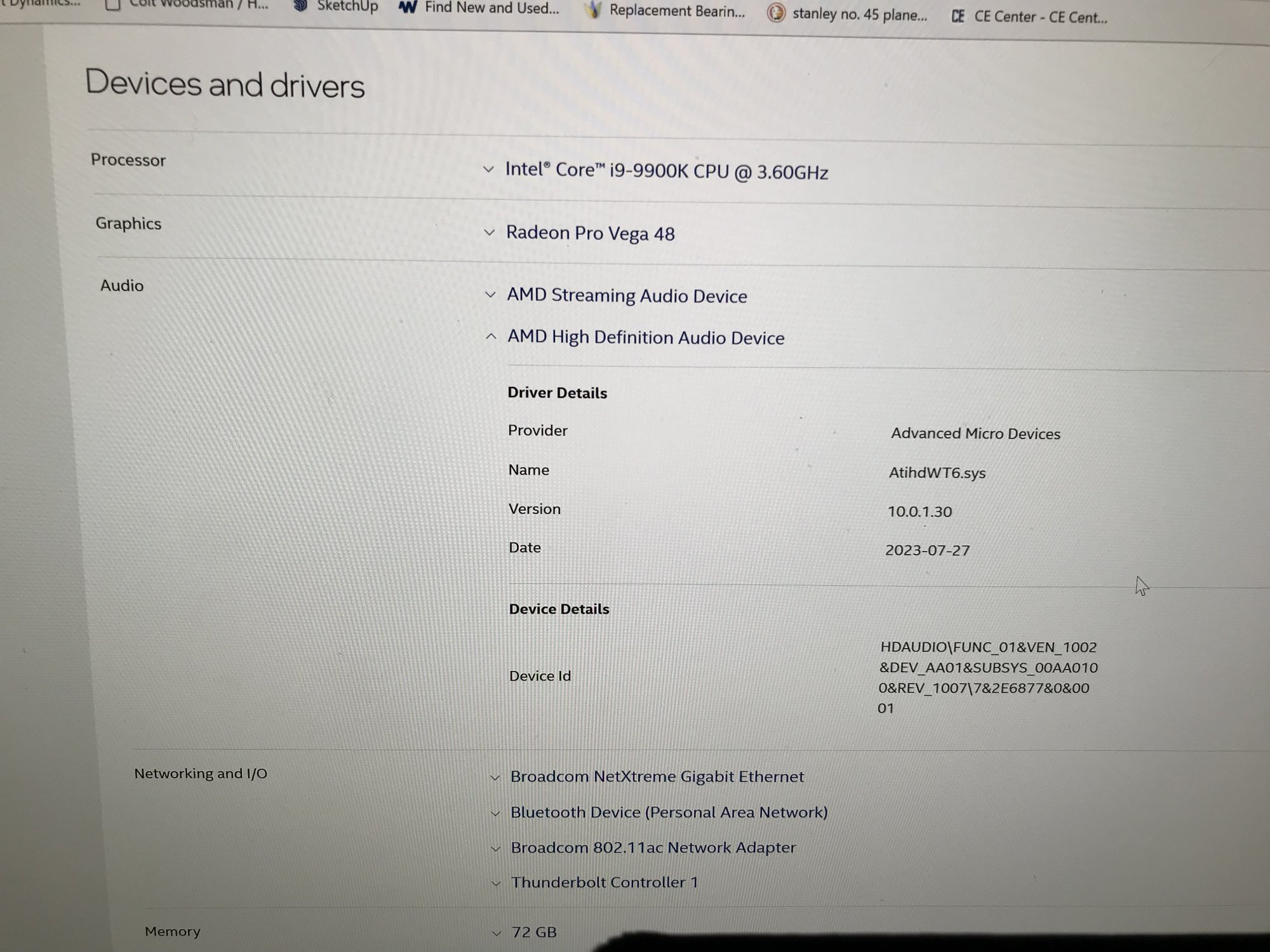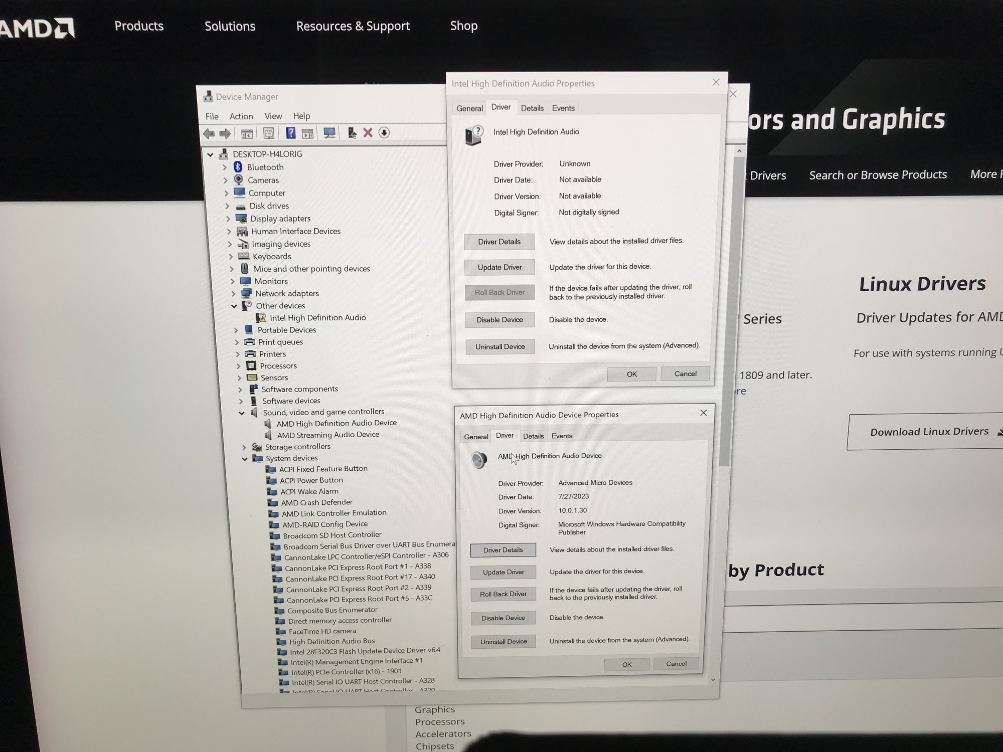 I have a 2019 iMac 27”, 3.6g 8core I9. In 2019 I also created a portable USB SSD using VMWare Fusion to put windows 10 and Bootcamp on the external drive. I did this by following instructions in an article I had found. It has worked flawlessly until yesterday when I updated AMD Radeon driver for my graphics card. Since then I get no sound while booted in Windows 10. Neither through internal speakers or through headphone jack. Windows shows “No output devices found” in the system sound tab. I do have sound when booted in Mac OS. According to Device Manager, the driver for Intel High Definition Audio is missing. I am unable to roll back driver because button is greyed out. When I try to update driver through Windows it says driver not available. I tried to update Bootcamp and that did not fix the issue. I tried updating drivers using 3rd party utility and it did show the Intel High Def Audio driver as one of the updates but it did not fix the issue. Device Manager still shows a yellow triangle and indicates no driver.