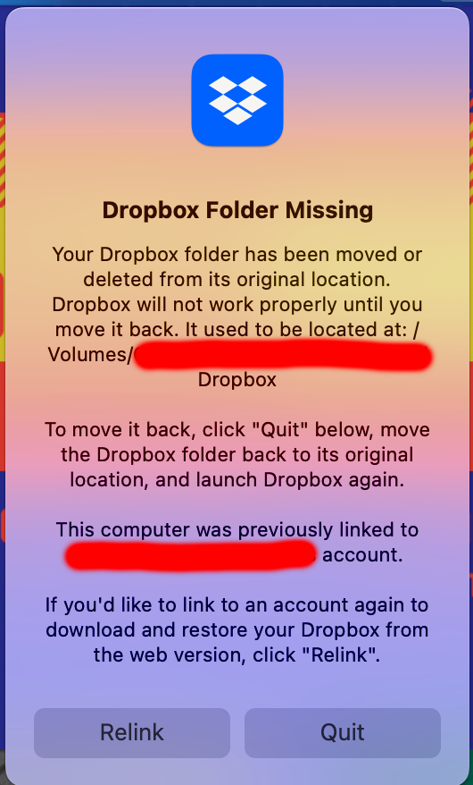 For whatever reason my Dropbox always disconnects itself after I restart my Mac Studio. When I boot up it prompts me to re-login to find it, then I have to follow the setup process and make sure it's pointed to my external G-Tech Shuttle XL or else it'll start syncing to my internal SSD. Has anyone come across this? I'm losing my mind because every time I restart it has to re-sync/verify all the files in my dropbox which takes a long time.