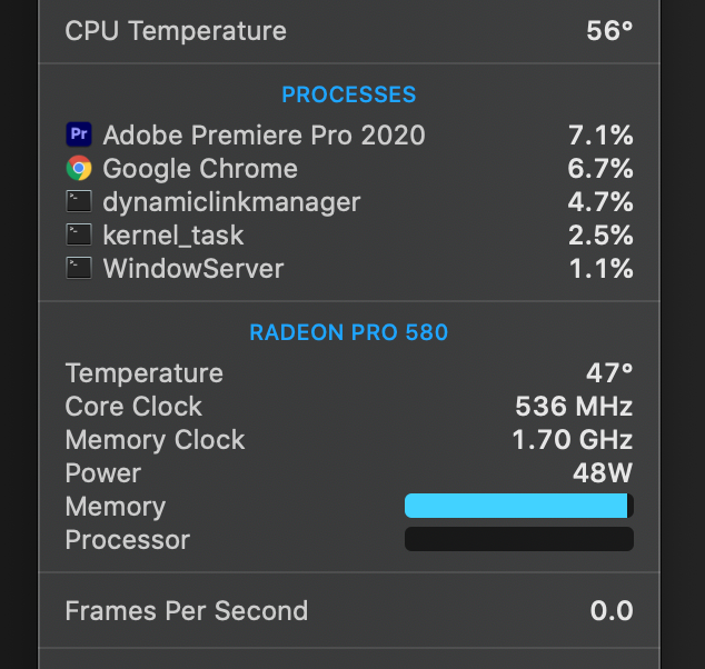 I'm fairly happy, but wondering as I sometimes see during h264 export that my Vega II maxes out at 99% of GPU processor and memory - what some of you with dual Vega IIs are observing during their day to day work. I know how crazy expensive the standalone Vega MPX module is and dont know if it would offer any significant benefits for me.. does Premiere use the link between the two cards at all? Is it able to utilize a second GPU? What are your observations?