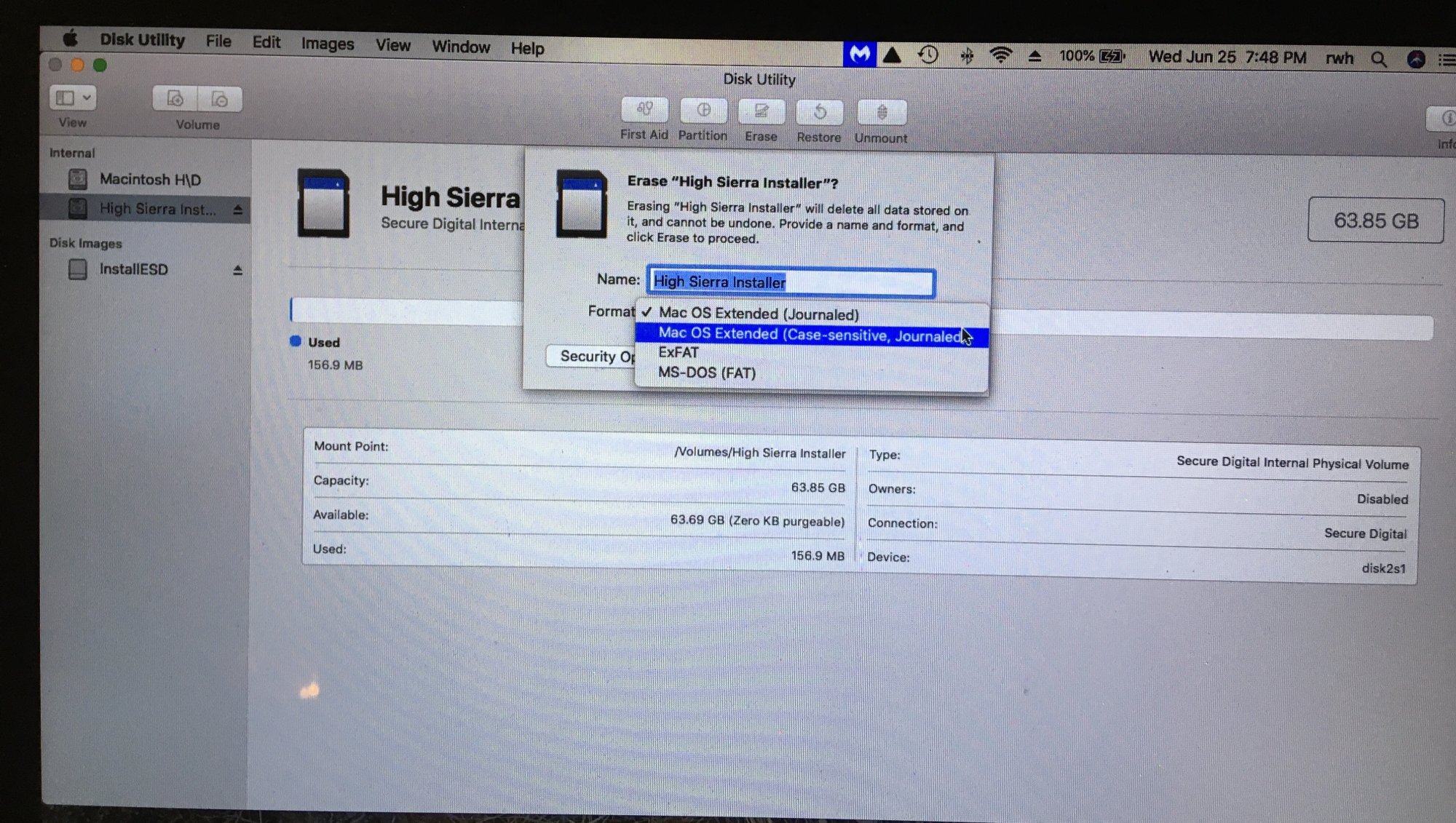 SD card shoud be pre-formatted to "Mac OS extended, journaling enabled, GUID partition format" (using disk utility).