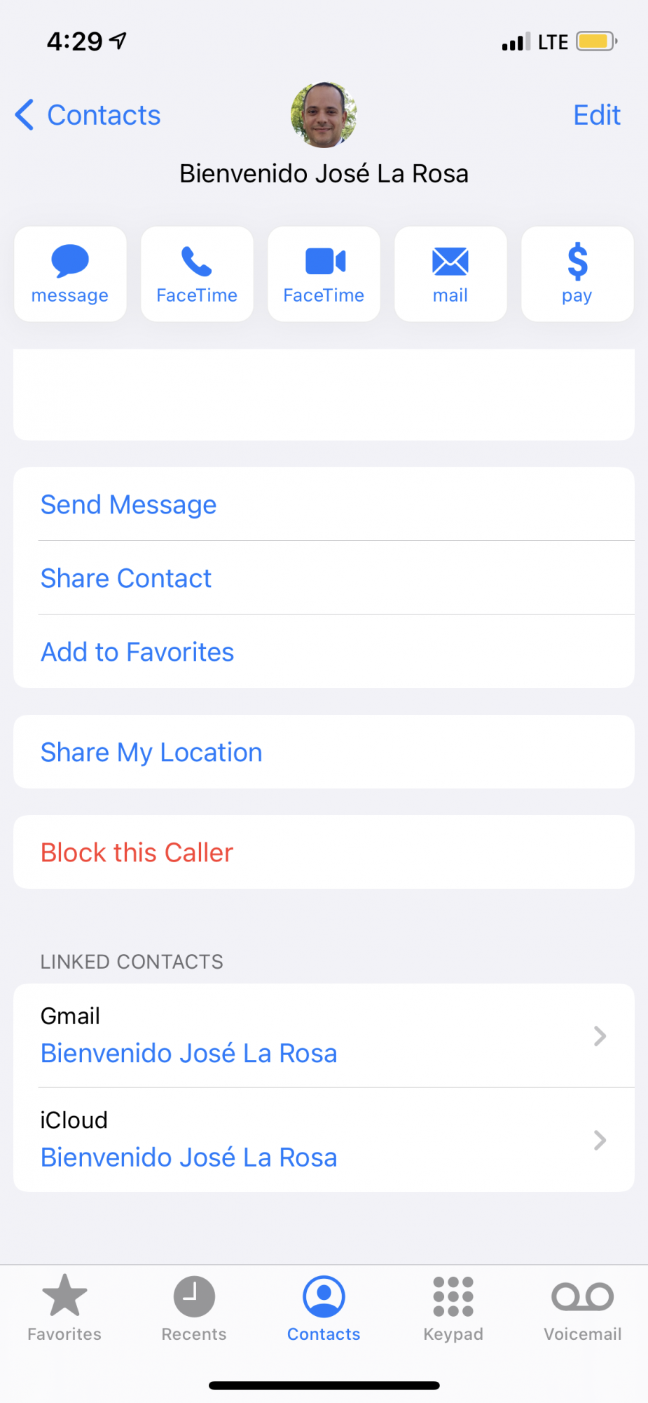 Here's a screenshot of one of my contacts who has two linked contacts, both pointing to the same person.