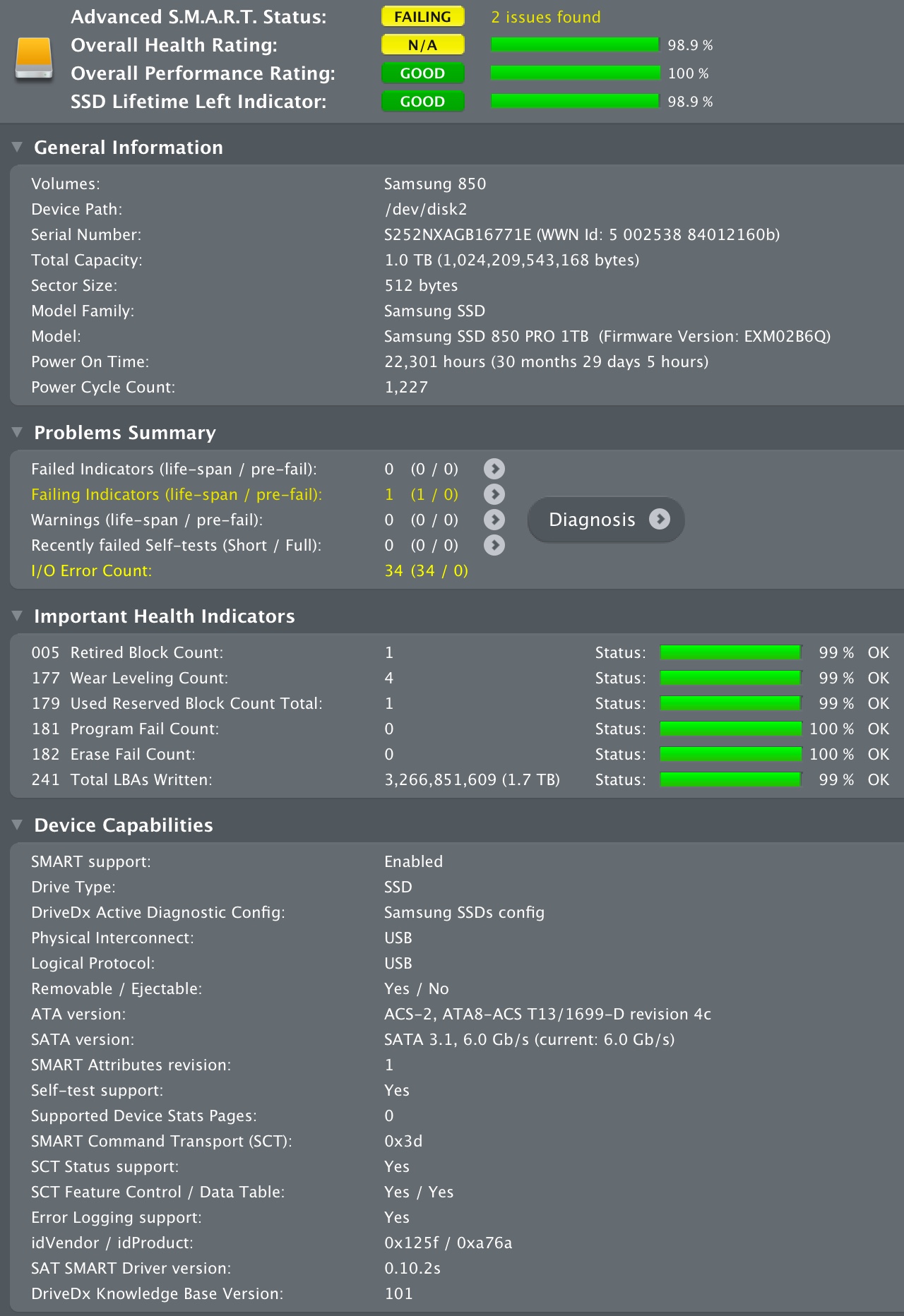 I've been running a Samsung 1TB 850 PRO SSD in a USB enclosure with Mac OS 10.12.6 on a mid 2012 rMBP 15. Recently I've noticed that DriveDx has been giving me errors with Flash Read Fail count at 644 (started at 13 about two weeks back). Running the Full Self Test has initially shown no errors before this thing started and subsequently I've seen that it has been giving errors at LBA 546,559,560. Yesterday when I re-ran the extended test it passed without errors.