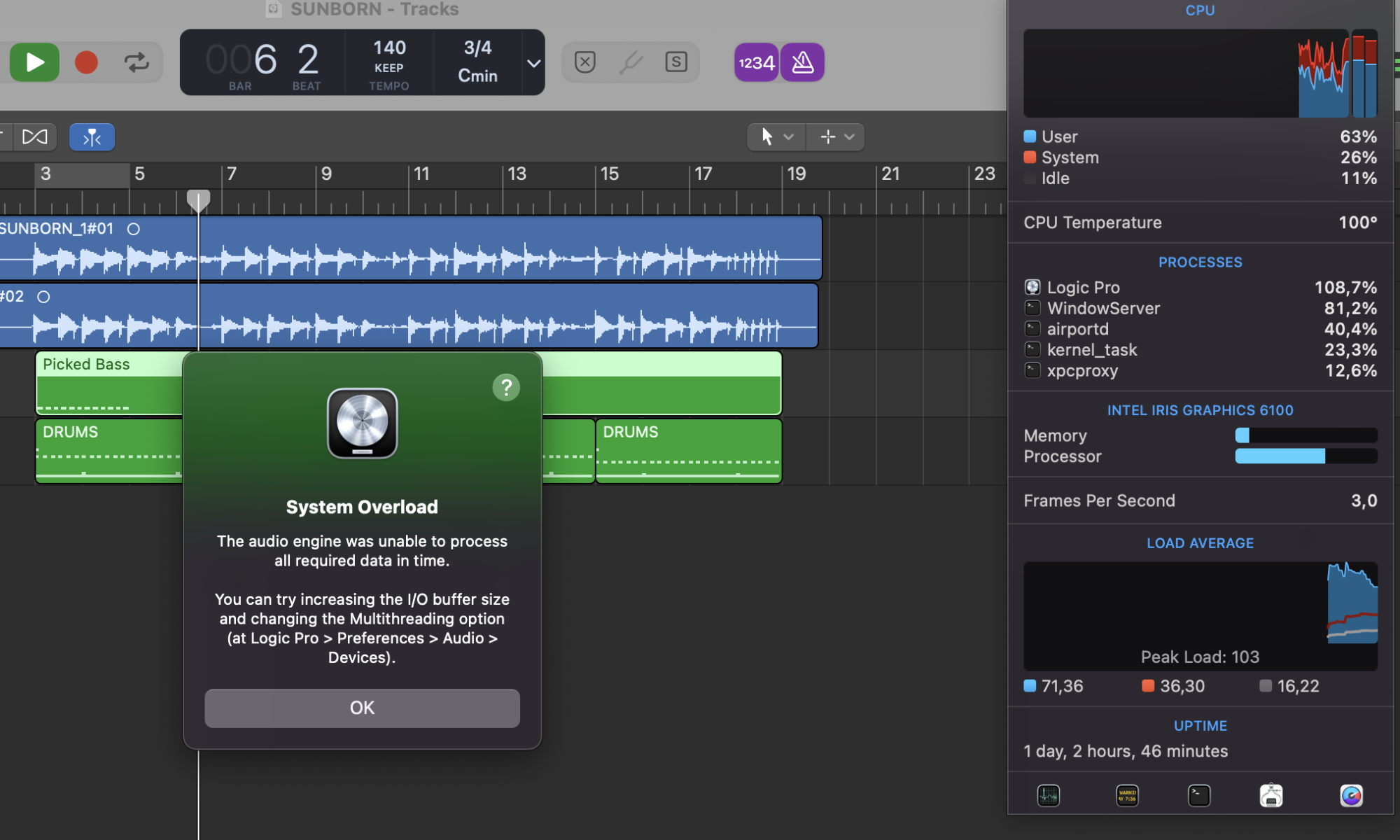 Logic Pro however gets a system overload if there's more than one track with plugins. I mainly use Neural DSP guitar modelling plugins or Kontakt Player 6. I've tried to do my research regarding the overload issue and configure my setup so that it wouldn't happen, but no matter what, according to the Logic processor monitoring the first two cores are running at 100% and the system overload message comes after a few seconds.