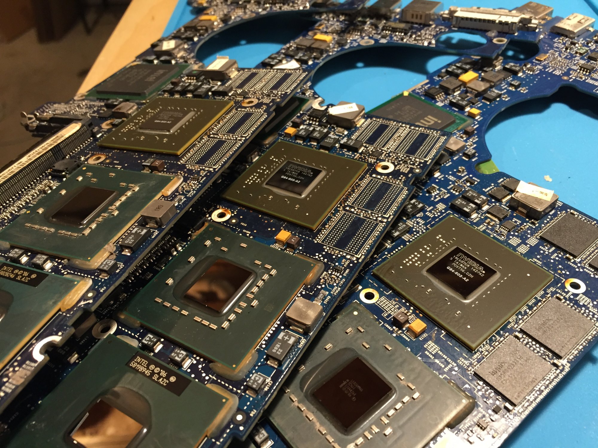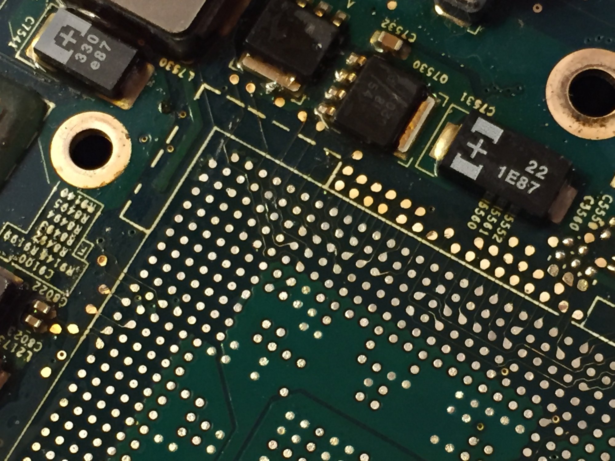 Well, I never thought it could happen, but what did I get in for repair today? A green dot sticker Early-2008 17" with GPU issues! Odd, right? Well, the first thing I noticed was that the symptoms it was experiencing were quite different from that of an actual failed GPU. In the case of this system, it would start booting no problem, no artifacting on screen, but eventually would just abruptly shut off. When powering back on, it would just turn the hard disk on, but no fans and no boot. Not the usual symptoms of a failed GPU for sure. The symptoms DID, however, match up to issues I experienced after performing my first ever GPU replacement on one of these, when the chip was not soldered properly due to my inexperience at the time. This behavior also changed when tapping the board on top of the area where the GPU is soldered. I opened the machine, saw that it already had an Apple-installed G84-603-A2 in there (complete with edge bonding), and proceeded to desolder it. Immediately upon removal, the issues were obvious. At least 4 solder balls were not soldered properly, and the solder mask was damaged in some areas (which happens if you use too much pressure when wicking the board), pictured below. Obviously a pretty bad job done by Apple's contractors. Luckily the solder mask wasn't bad enough to cause issues with re-installation, so fortunately, after installing a brand new G84-603-A2 (although I could have simply reballed the original 603, I decided to install a new one just for good measure), the machine started working reliably again. Just goes to show I guess, that even if you have an Apple-installed 603, you could still have issues. Not because of the chip this time (as it would be with a non-revised 602), but simply poor soldering. Something to watch out for on some very few "green dot" boards.