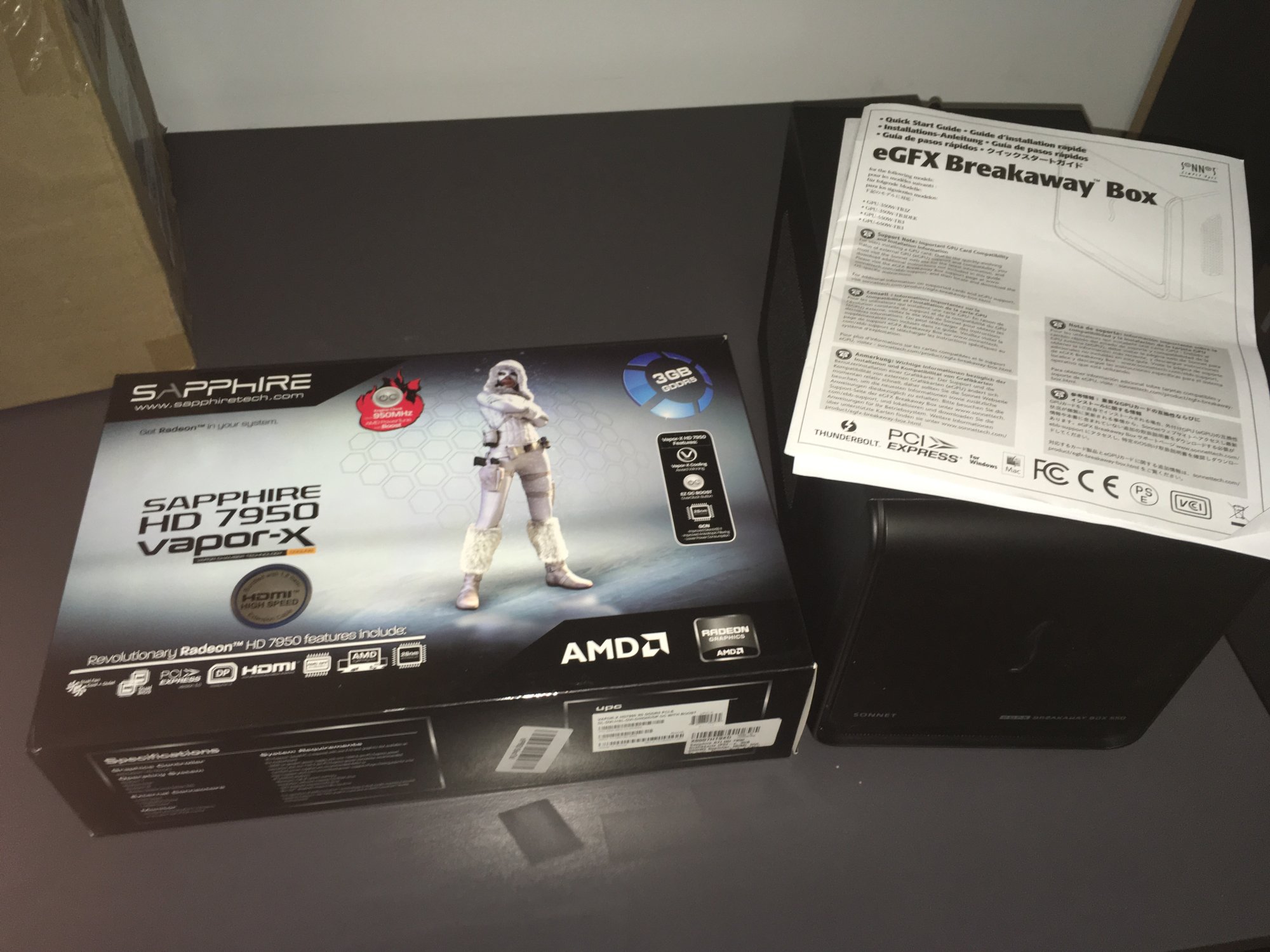Two of my latest conquests: an AMD Sapphire Radeon HD 7950 Vapor-X 3 GB for 48 bucks including shipping and a Sonnet eGFX Breakaway Box 550 for 67 bucks including shipping.