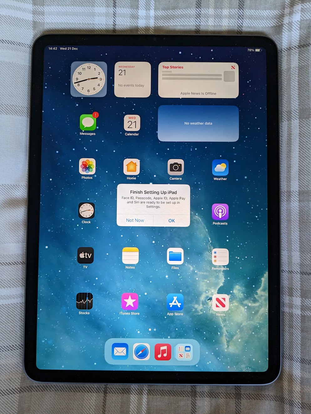When it arrived, the iPad was in sleep mode rather than being powered off. After pressing the sleep/wake button, the following screen was displayed with a message to ‘Finish Setting Up iPad’-