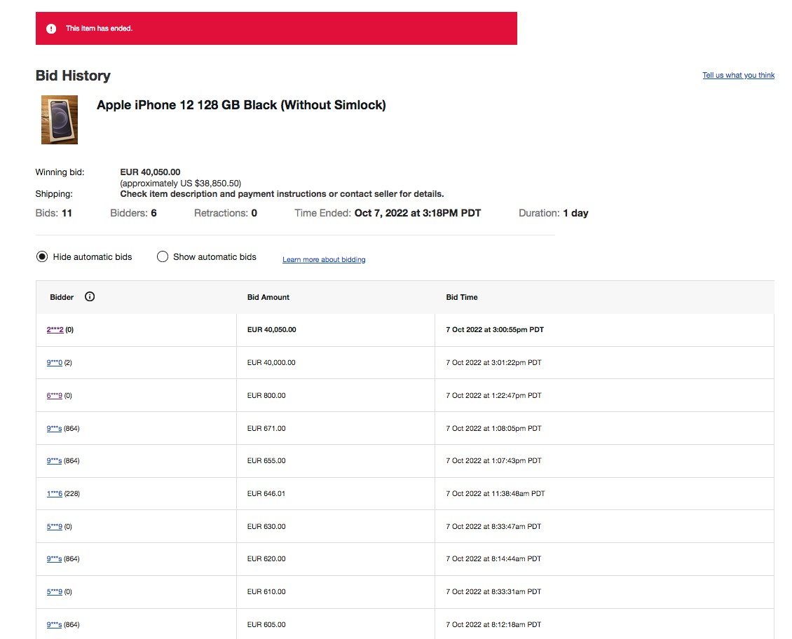 has the means to back that max bid — should the final sale price come to it. I’d love to see other auctions (on, well, pretty much anything) which share a bidding pattern much like the above, which closed without a hitch and positive, mutual feedback followed.