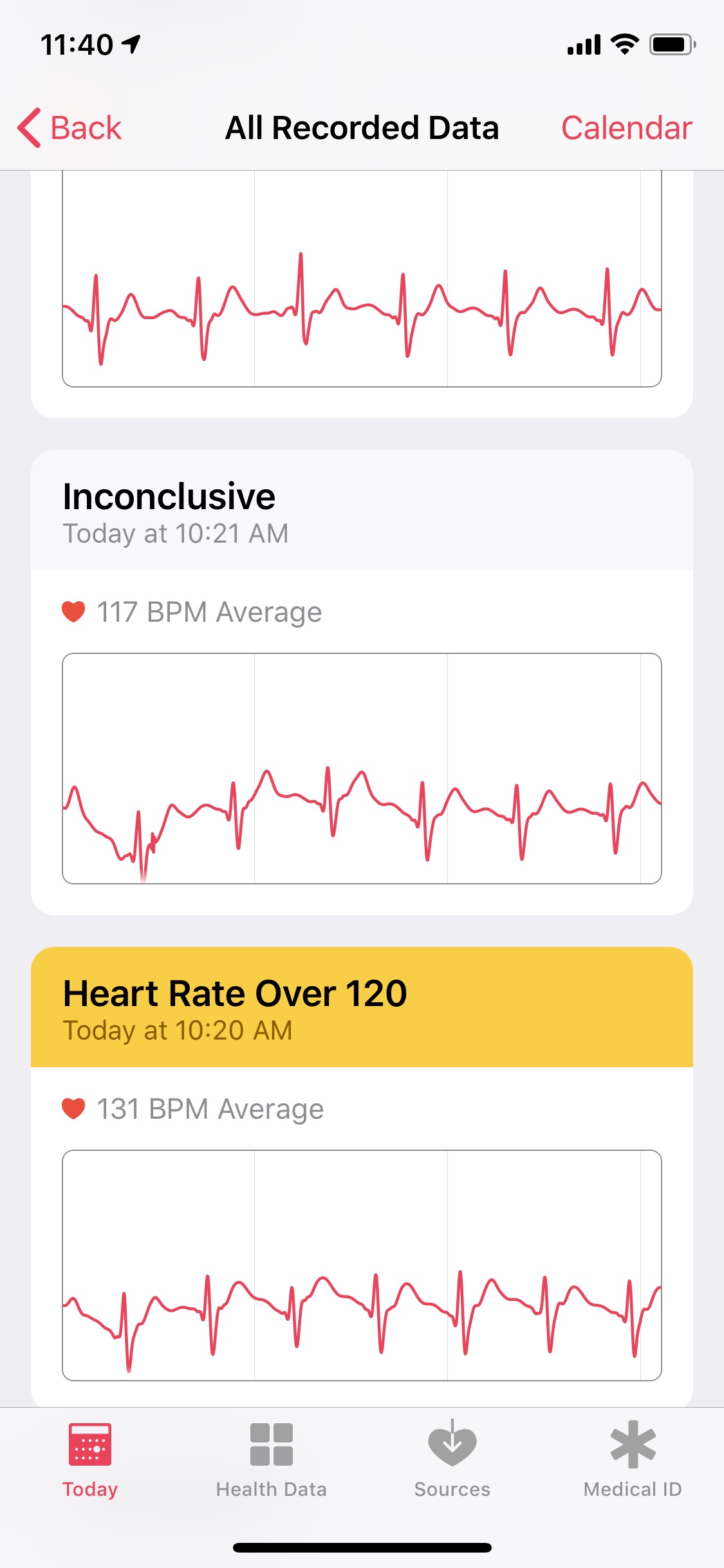 As soon as I got off the treadmill I did an ECG and said HR was high. Then did 3 more and got inconclusive and thought is was discarding or not saving this data so I keep trying. On the 4th ECG my HR had dropped below 100BPM and got a Sinus reading. On my HR Recovery you can see when I was running the ECG. Also see another ‘blip’ misread on my highest HR at 8 seconds.