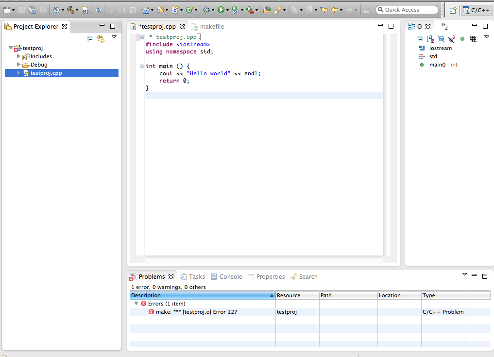 I'm very close to throwing something at a wall right now. I've spent hours trying to get eclipse c/c++ to work on my computer. I have a mac that runs Snow Leopard, and I installed Eclipse Juno (I already have xCode, but I need to use eclipse for instructional purposes). So first, it kept telling me that gcc and g++ could not be found in PATH. So I went online and tried to find answers, and then I tried to resolve it using the .bash_profile file and other such ideas that took research and then trying multiple different inputs. Everyone seems to have their own little way to resolve it but it doesn't work specifically for me. I finally resolved it by reinstalled the CDT individually from the Juno package. That error stopped. Then I tried writing a simple hello world program given code here: