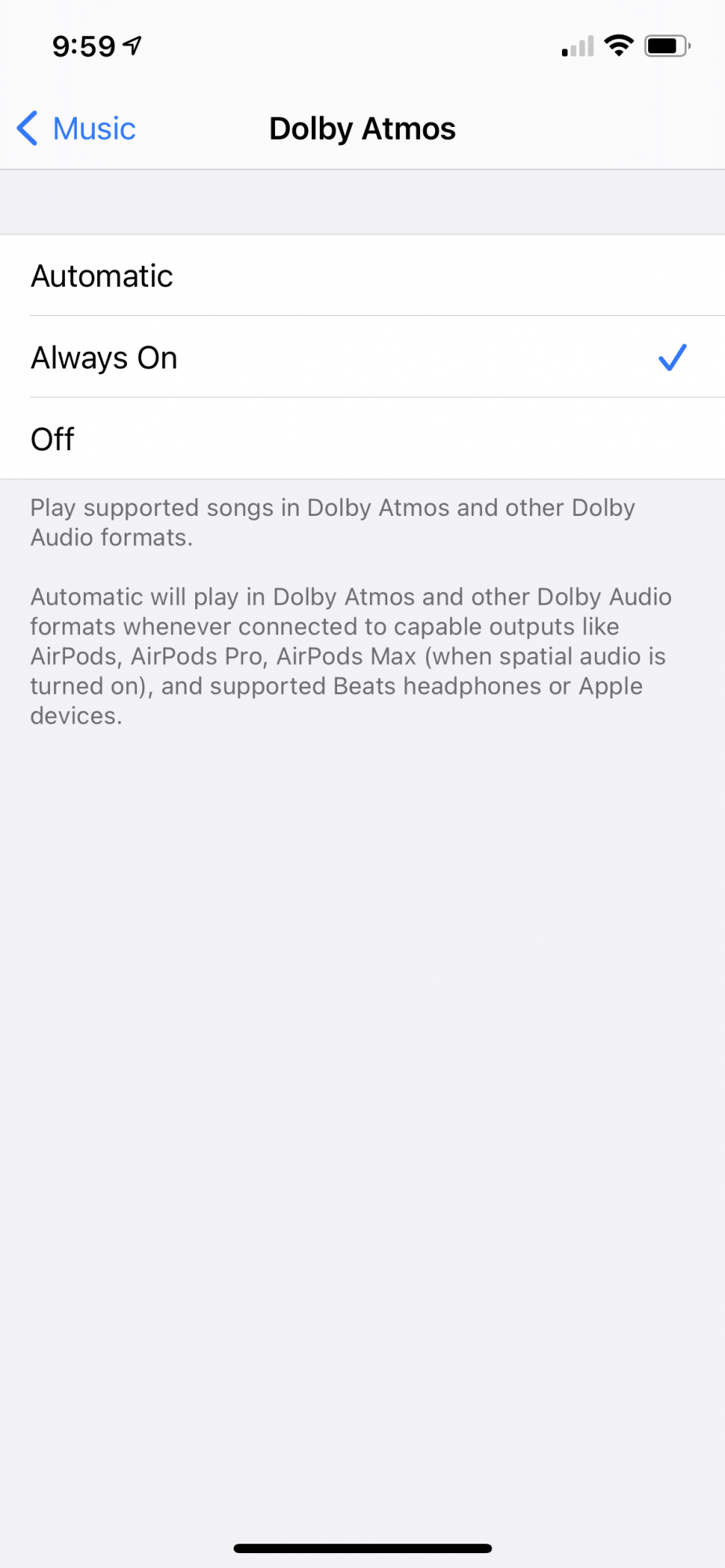 - iOS: Settings app > Music > Dolby Atmos > Always On