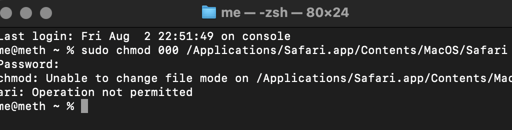 sudo chmod 000 /Applications/Safari.app/Contents/MacOS/Safari