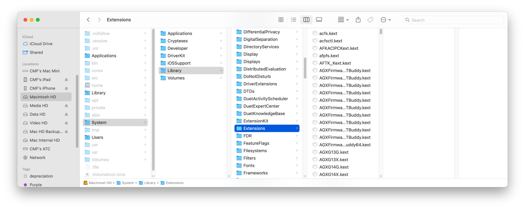 Sorry @Engender I was looking inside the wrong path. The extensions do show up when my Mac is not connnect to my eGPU. Here is a screenshot.The location of those drivers are Macintosh HD>System>Library>Extensions.