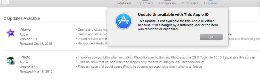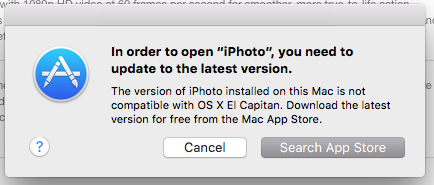 I am trying to upload video footage from an SDHC card to my macbook. I have had no problem doing so up until updating to El Capitan OS X. iPhoto was replaced with Photos and this new app cannot recognize the videos on this SD card. Photos is the only app that opens upon inserting the card. It simply says "No Photos" although i have a bunch of video footage on there. So i search iPhoto on my macbook and it says I no longer have it because my version was not compatible with the new El Capitan update. So i press "search app store" and i am prompted with "this app is not yet available in the US" ??? I am so confused, so I go to the "update" section on the app store and it says i can update my iPhoto. When I click update I am then prompted with "This app cannot be updated because it was purchased with another apple ID or the purchase has been returned or cancelled." SOMEONE HELP.