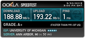 So that's actually the Ethernet speed, so maybe that's a little unfair. But I just did a Wi-Fi test from my dorm room, and it's also impressive (but definitely not as crazy).