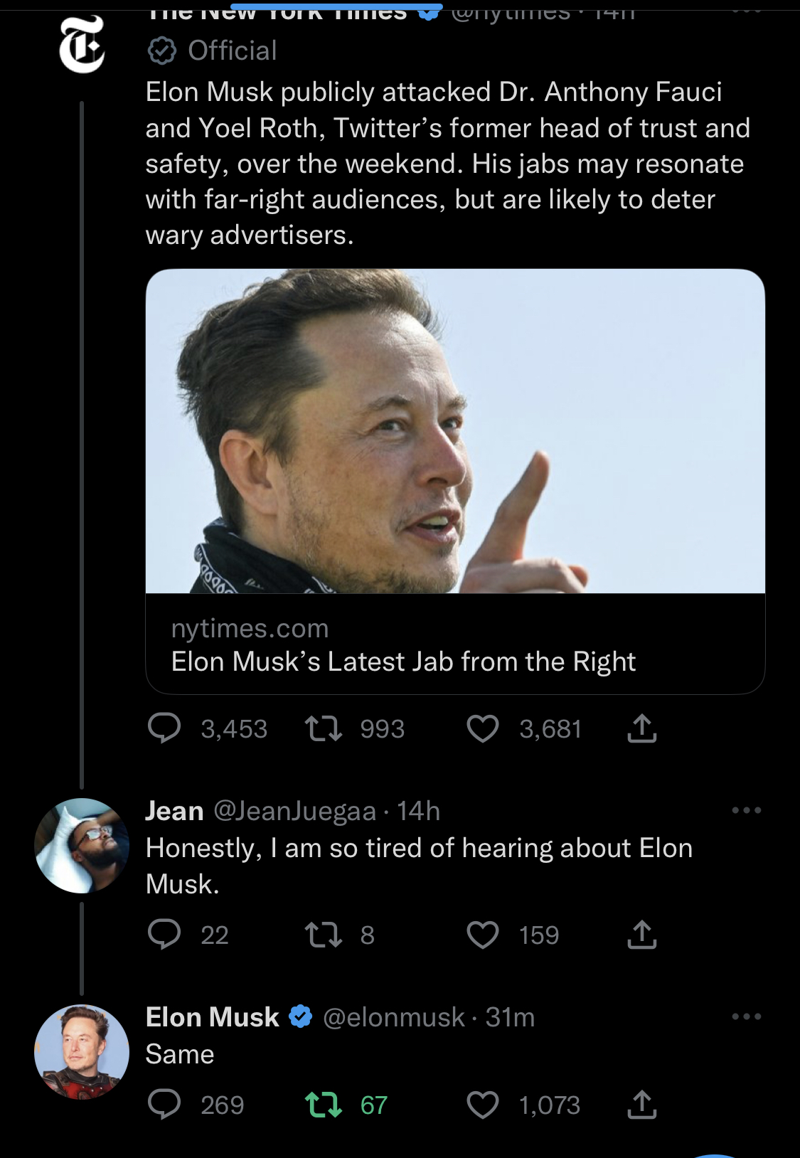 He deleted his own tweet. Is that against free speech?Still avoiding the hypocrisy. He gets resoundingly booed at Dave Chapelle's show. Someone posts the video of him being booed on Twitter. Musk deletes the tweet. And you want to grandstand about "free speech."