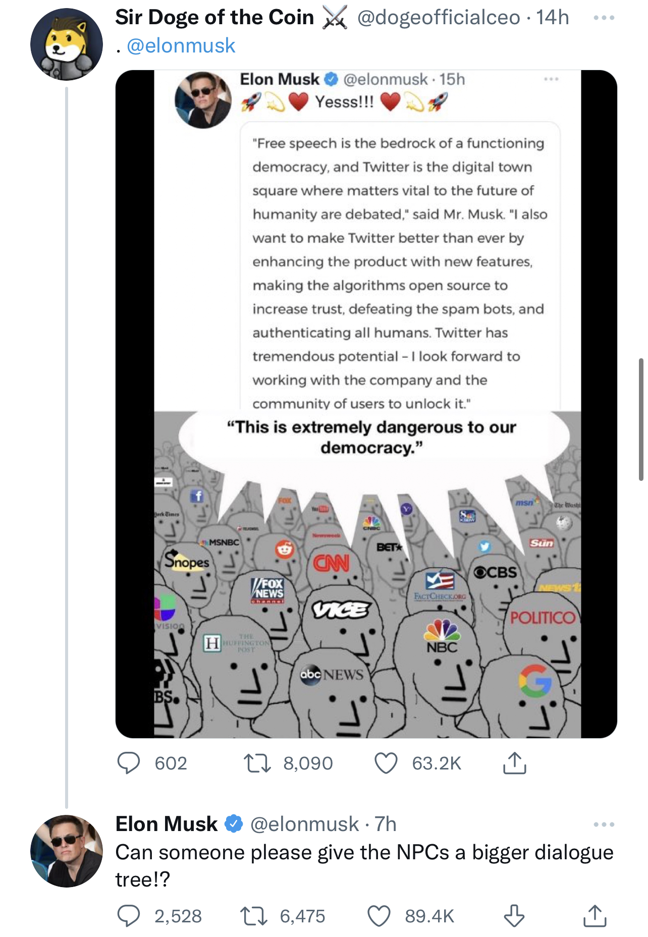 I hope that, under this new ownership, Twitter moves in a direction in which the dialogue of both sides is elevated well beyond this. Am I skeptical of that being possible? Sure.Yep... someone sees a tweet that says "Hillary eat babies" and they think "Yeah that checks out" and they just send it along.