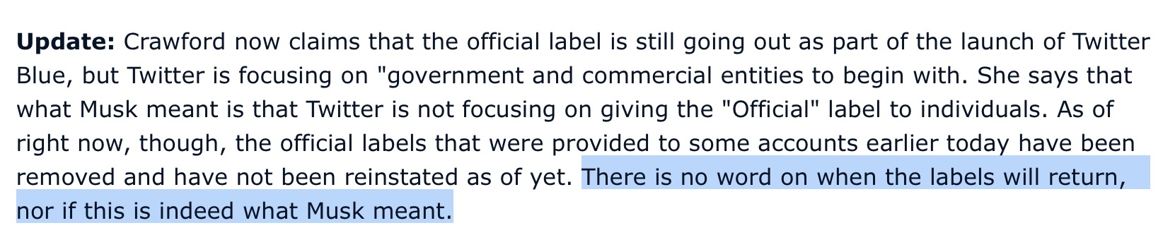 Update: Crawford now claims that the official label is still going out as part of the launch of Twitter Blue, but Twitter is focusing on "government and commercial entities to begin with. She says that what Musk meant is that Twitter is not focusing on giving the "Official" label to individuals. As of right now, though, the official labels that were provided to some accounts earlier today have been removed and have not been reinstated as of yet. There is no word on when the labels will return, nor if this is indeed what Musk meant.