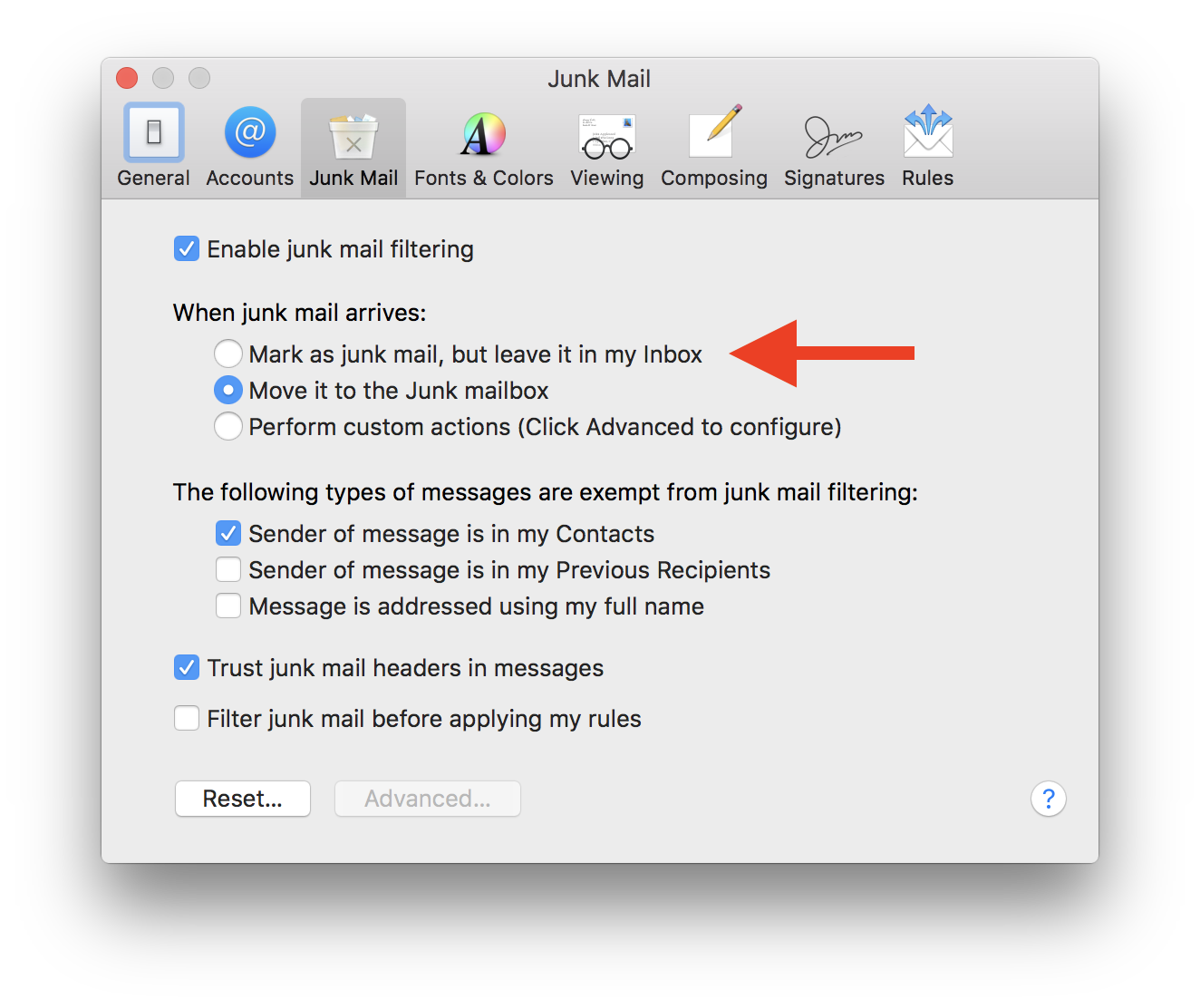 Have you tried the first option, Mark as junk mail, but leave it in my inbox, under When junk mail arrives?