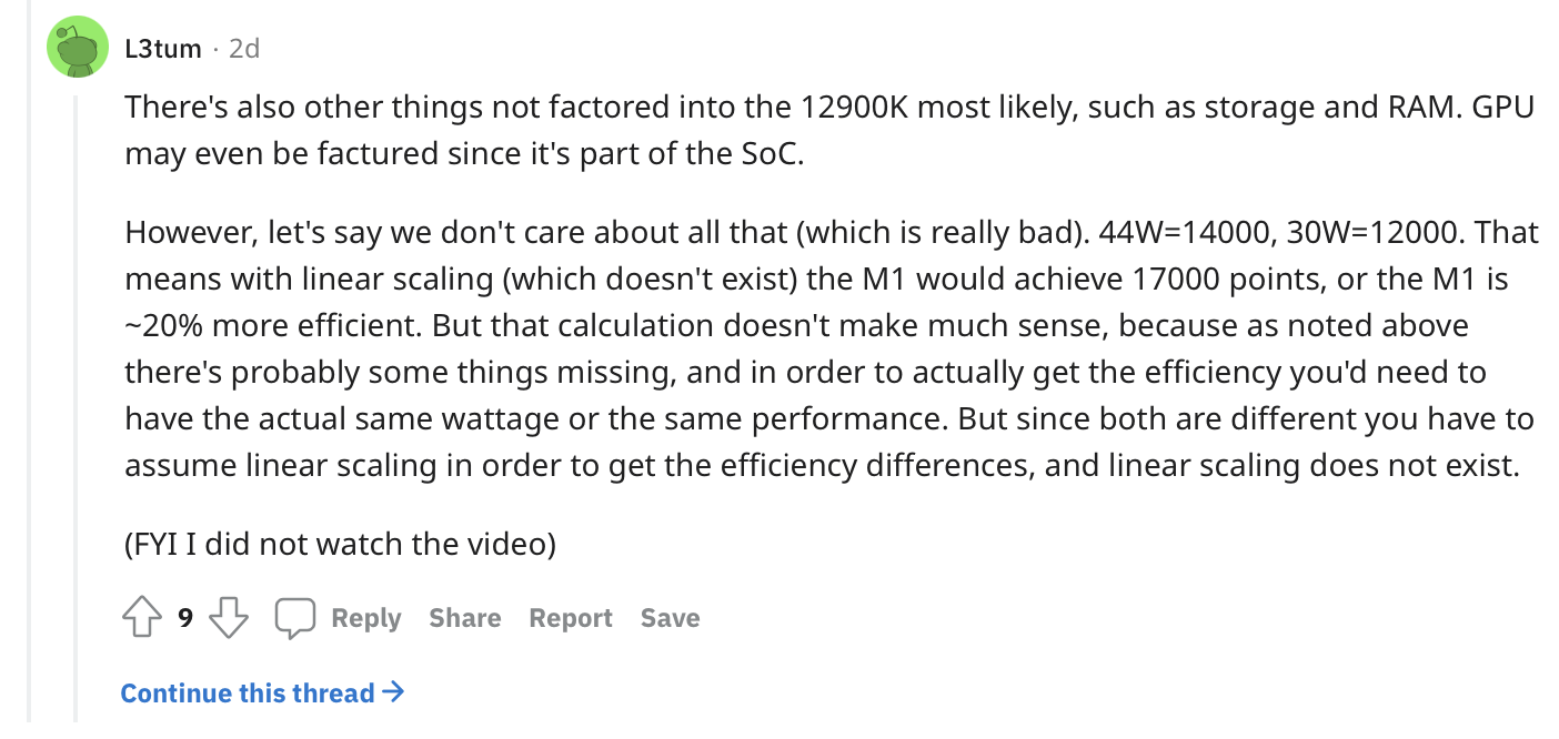 Eh let’s wait for real world performance and implementation. You’re acting like Apple is doomed because in this one instance that you cherry-picked and misconstrued, Intel has gotten “closer” to Apple.I get that but doesn't change the fact that Intel is now able to come very close to M1 Pro/Max with 7nm and x86. Is it not concerning? And M1 Pro/Max actually uses 35W according to Anandtech.
