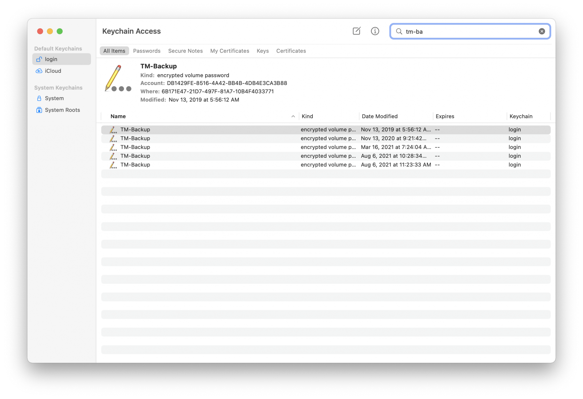 Can anybody confirm to me, that encrypted volume passwords only are saved in the local keychain? Is there any way to recover this password? I've used the same Password for the backupdrive, as for my Systemdrive which is encrypted with FileVault. But i cannot find a way to restore this Password either. Any Help appreciated.