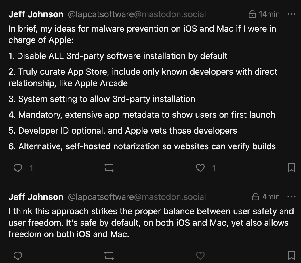 Third, this is just his opinion stated as if it’s a “fact” with zero supporting evidence. He asserts that the App Store is allegedly not for protecting customers, but cites zero evidence for his claims. He’s just assuming his own premise… The fact of the matter is, multiple things can be true at once. The App Store can protect customers (and it does according to the data on the malware risks of sideloading),