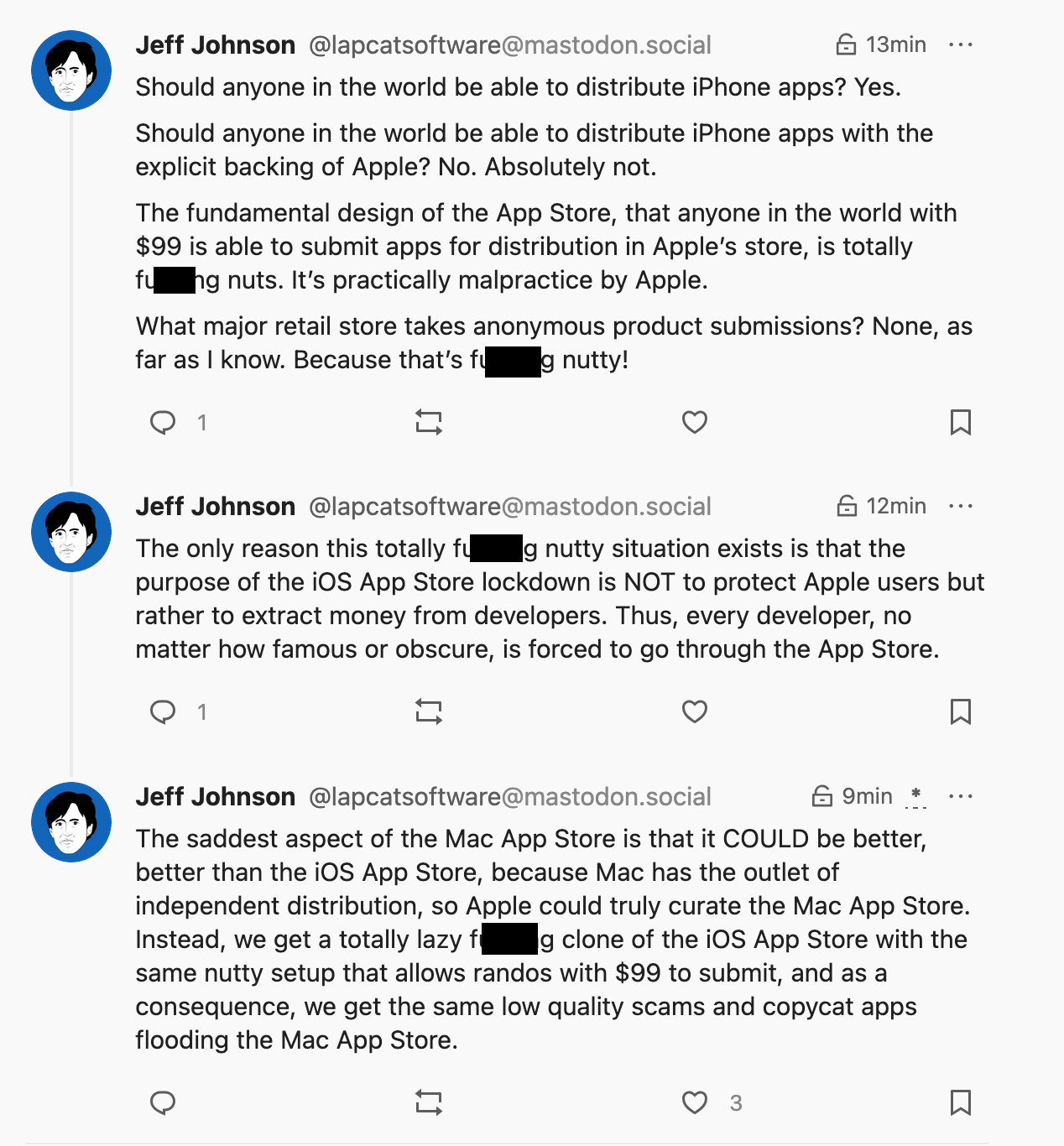 And finally, the App Store isn’t a “nutty” system, it has been demonstrated by the data (as I mentioned already) to protect customers better. And not just any “rando” can successfully publish an app into the App Store (also as previously mentioned). Developers must create developer accounts to which the apps are linked, and they can be submitted, but must be reviewed before publication into the App Store. Again, not as he makes things seem… If the App Store model were so “nutty” then how come basically every major vendor has emulated it? How come customers tend to prefer using it? Again, he makes more unhinged assertions with zero evidence…