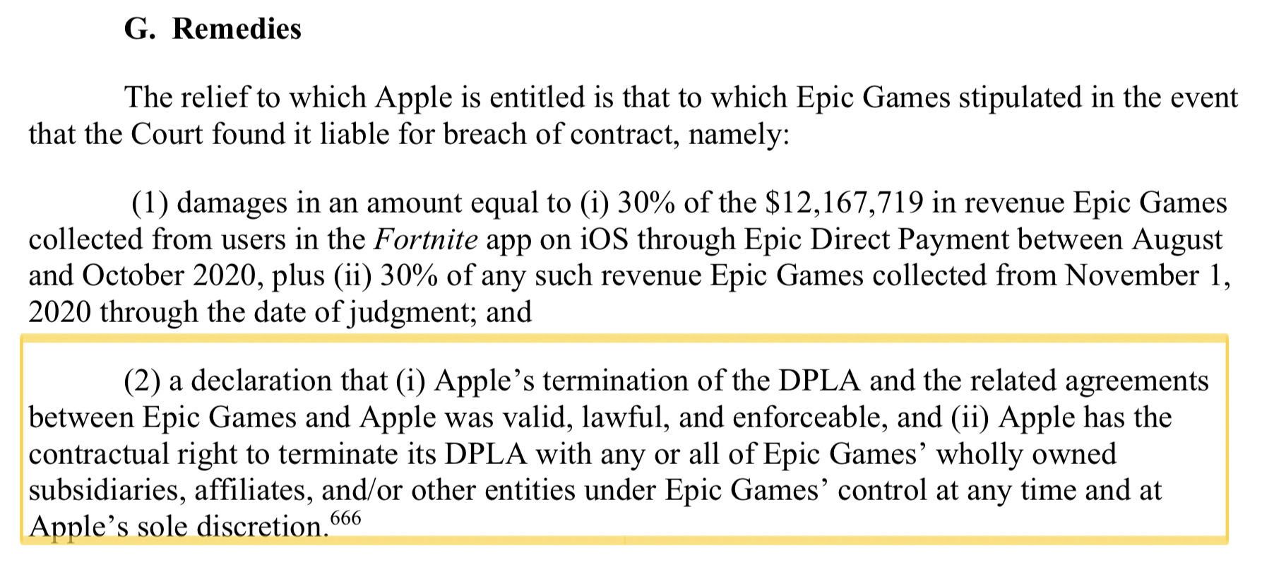Apple may have to provide third-party app payments for others but EPIC is done on the App Store.You must have missed the part where Apple is allowed to permanently ban Epic from the App Store, and now even terminate their subsidiary developer account used to develop Unreal Engine. Epic is basically out of business now. Page 180 of the ruling. I’ve attached it here for your convenience. Sorry for ruining your day.