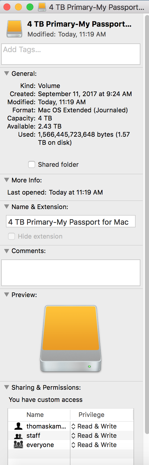 Here are the stats for the involved players: Computer is a 2014 MacBook Pro running High Sierra 10.13.6. External Hard Drive is a "WD My Passport for Mac" formatted as MAC OS Extended (Journaled).