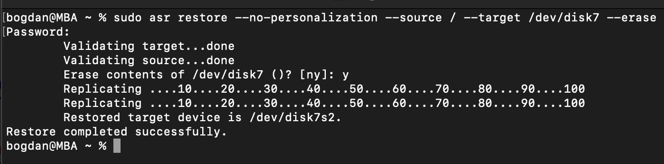 Code:sudo asr restore --no-personalization --source / --target /dev/disk7 --erase