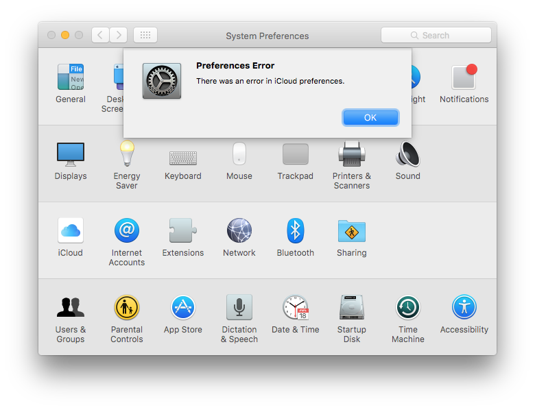 I get an error "Preferences error" whenever I try to open iCloud preferences from Spotlight, however it works fine if I go to the system preferences panel and I open it from there.