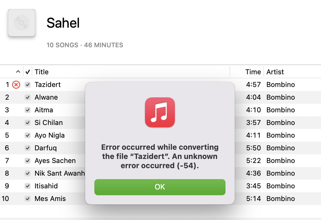 Sometimes ago using iTunes I had the same error -54 : I had already the song I was trying to import