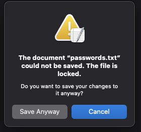 But the permissions look fine to me and nothing is locked on the file's get info. It also creates this strange looking file after saving it