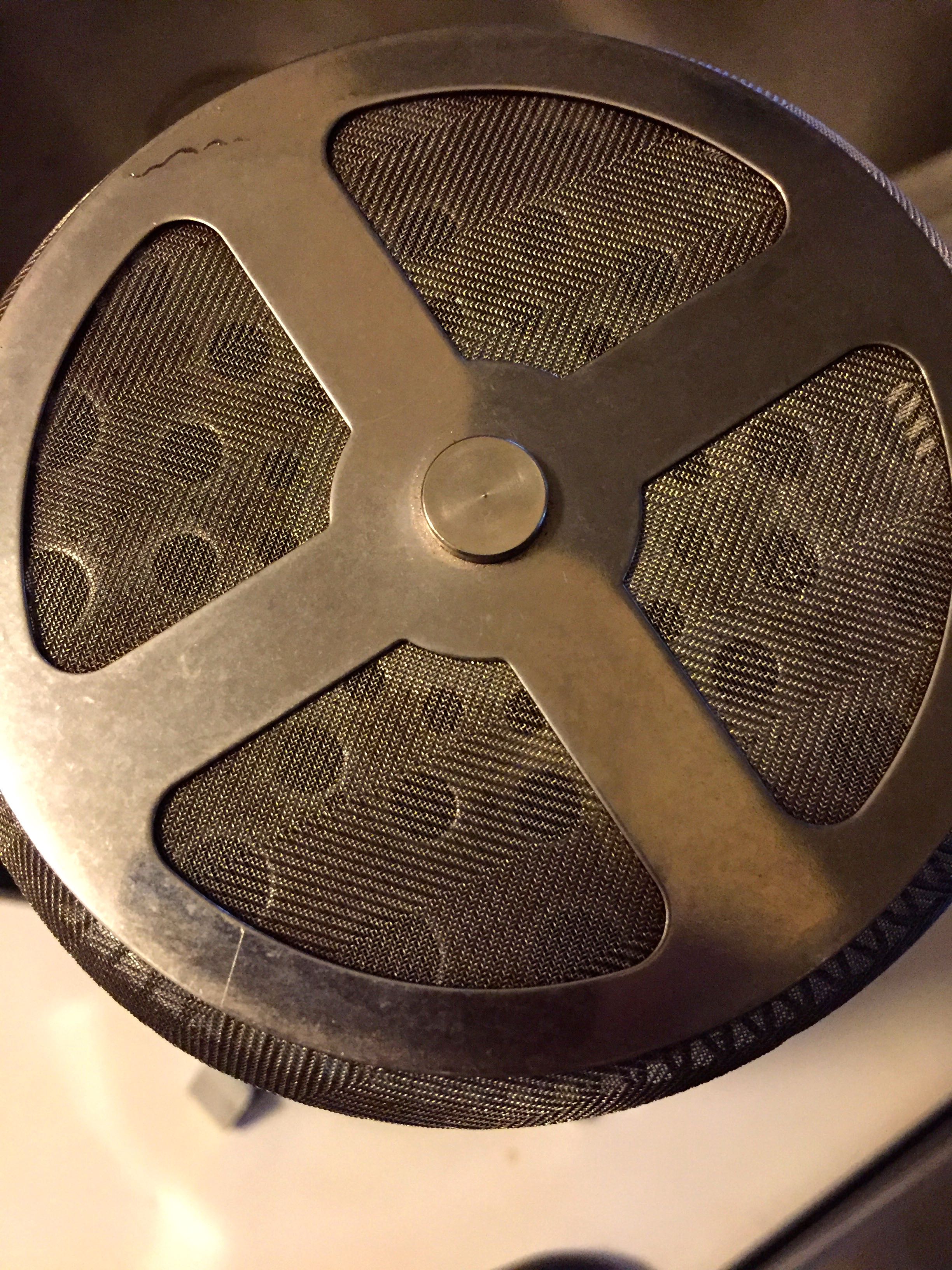 What about the grounds in between the plates?! For a couple of months, I'd loosen the plates and pour in hot water into the FP and then plunge it up and down. It got it clean and I was able to wipe down the plats with a hot towel. But this ruined the metal filter. I frayed the ends, which I suspect led it to shatter later on near the end of that time period. Thankfully I'd just poured the water in and not filled it up.