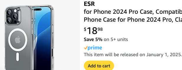I just checked Amazon and ESR case for "2024 iPhone" won't start shipping until after 1/1/2025.